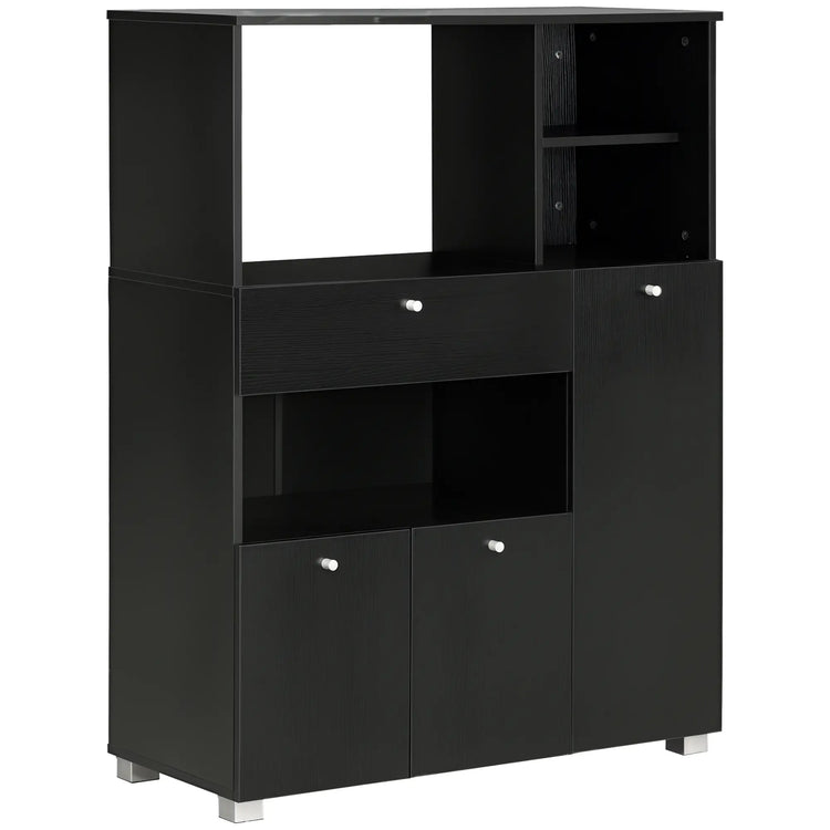 Upgrade your kitchen with this sleek black microwave cabinet, designed for stylish and efficient storage. Perfect for kitchens, pantries, or dining rooms, it features ample storage space, including shelves, drawers, and an open countertop for your microwave or coffee maker. Its sturdy particleboard construction ensures durability and easy maintenance.