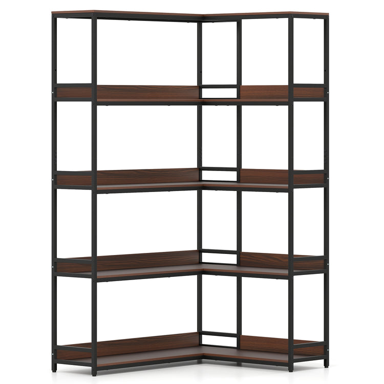 Corner Bookshelf, 5-Tier L-Shaped Bookcase, Walnut Metal Frame