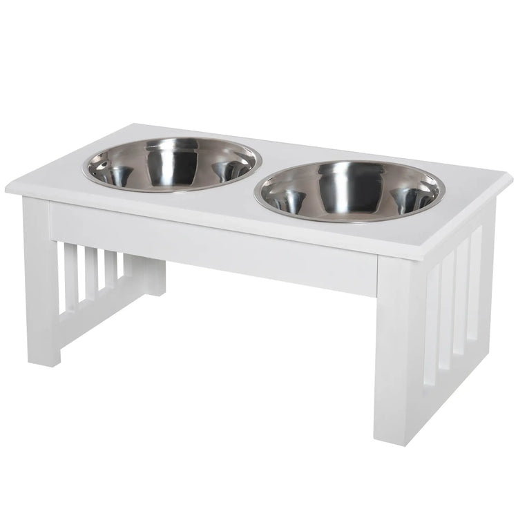 Double Pet Dog Bowl Stand, Elevated Wooden Feeder, Stainless Steel Bowls, White