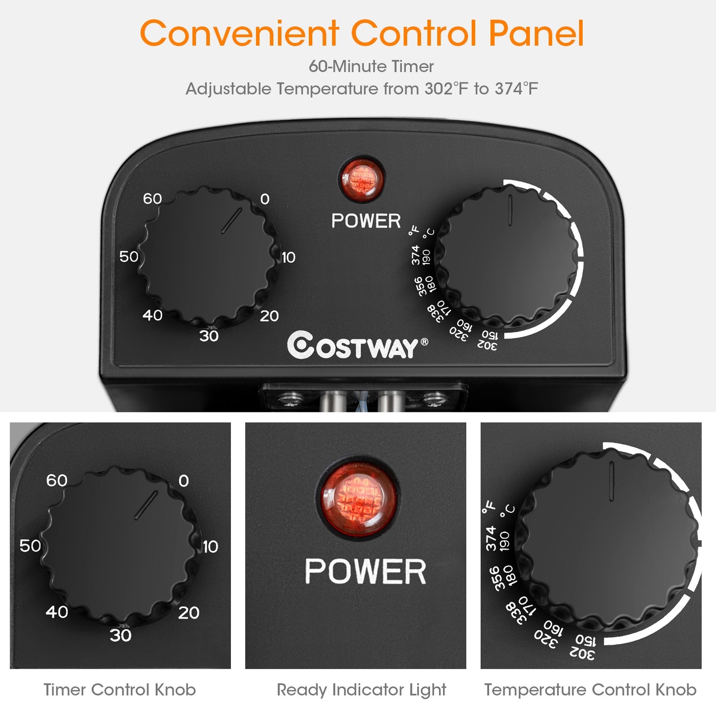 • Equipped with temperature control knob (from 302 to 374 degree Fahrenheit) and 60-minute timer to meet your different needs