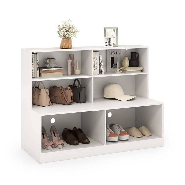 Smart Storage Options: Tired of clutters? This shoe rack is your savior with a roomy tabletop to drop your keys and bags, plus 4 handy storage cubes for your essentials, and 2 spacious lower compartments designed to fit every shoe in your collection, from heels to hiking boots.Bench Seat Holds up to 440 LBS: The 2-in-1 shoe cabinet more than just a place to stash your shoes - it's a robust bench that can handle up to 440 lbs! Made with thick, reliable boards, it's a sturdy companion for your daily comings and goings.