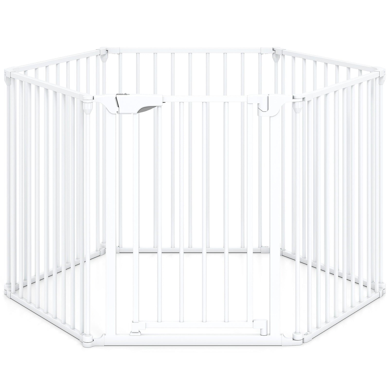 Expandable & Configurable Design: The 6-panel safety gate stretches smoothly from 34.5"-154", fitting diverse entryways and openings in your home. The 270° rotating hinges let you effortlessly reshape the barrier into straight, L, or U configurations, tailoring the setup to suit your fireplaces, stairways, or doorways.Enhanced Safety with Lockable Door: Equipped with a secure double-lock system, the pet safety fence ensures that children and pets remain safely confined to the designated area. The door conveniently stays open at a 90° angle for passing through and swings shut automatically when released, contributing extra peace of mind.