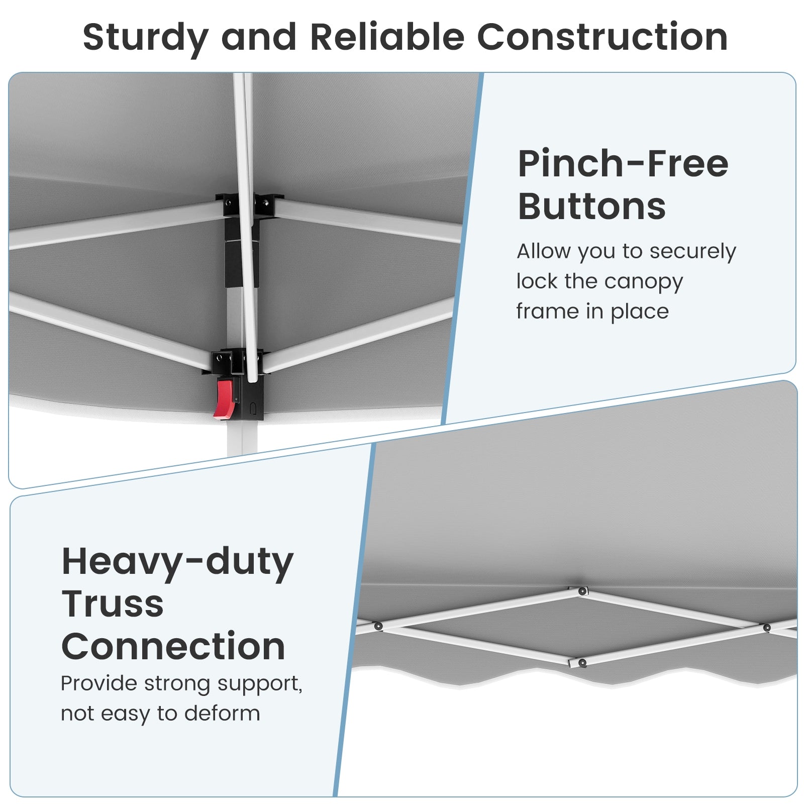 3 Adjustable Height Settings: The folding outdoor shelter measures 10 x 10 x 8.7-9.4 ft/300 x 300 x 266-286 cm (L x W x H), offering a large sunshade area of 100 sq.ft/9 m2. And the height can be adjusted in 3 positions (8.7/9.1/9.4 ft, 266/276/286 cm) through pinch-free buttons, perfect for accommodating different activities and group sizes.