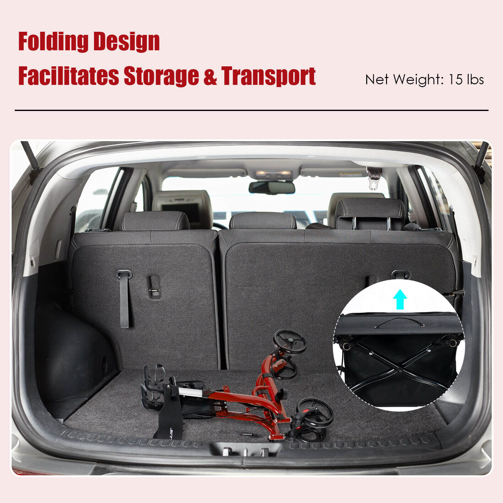 Easy Folding and Transportation: The rope on the seat allows you to fold this rollator walker with one hand in no time. Hence, the compact size makes it easy to put into the trunk of a car and store in the corner when not in use. Also, it's easy to adjust the width of the rollator to pass through some narrow corridors.