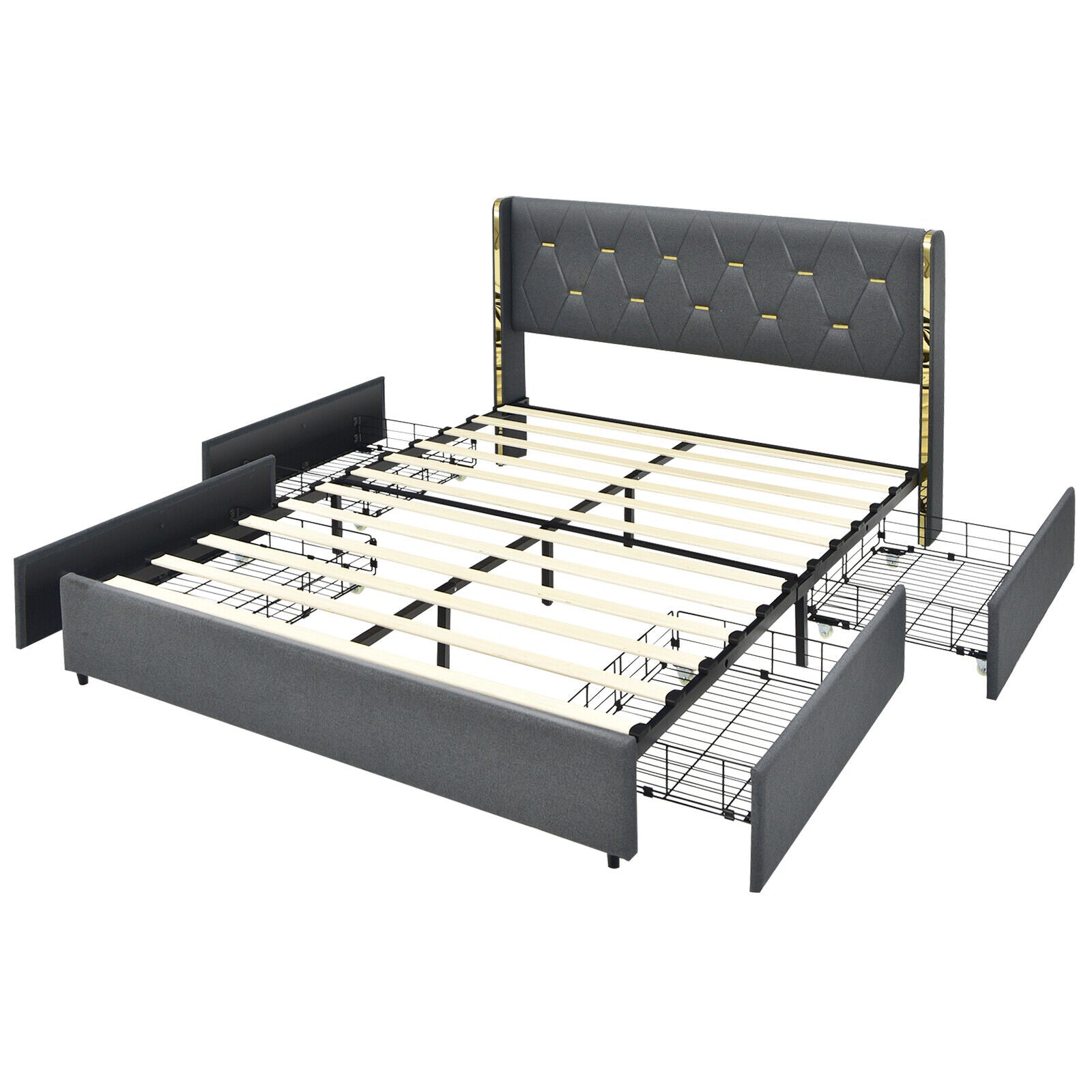 Full Queen Size Upholstered Bed Frame, 4 Storage Drawers, Black