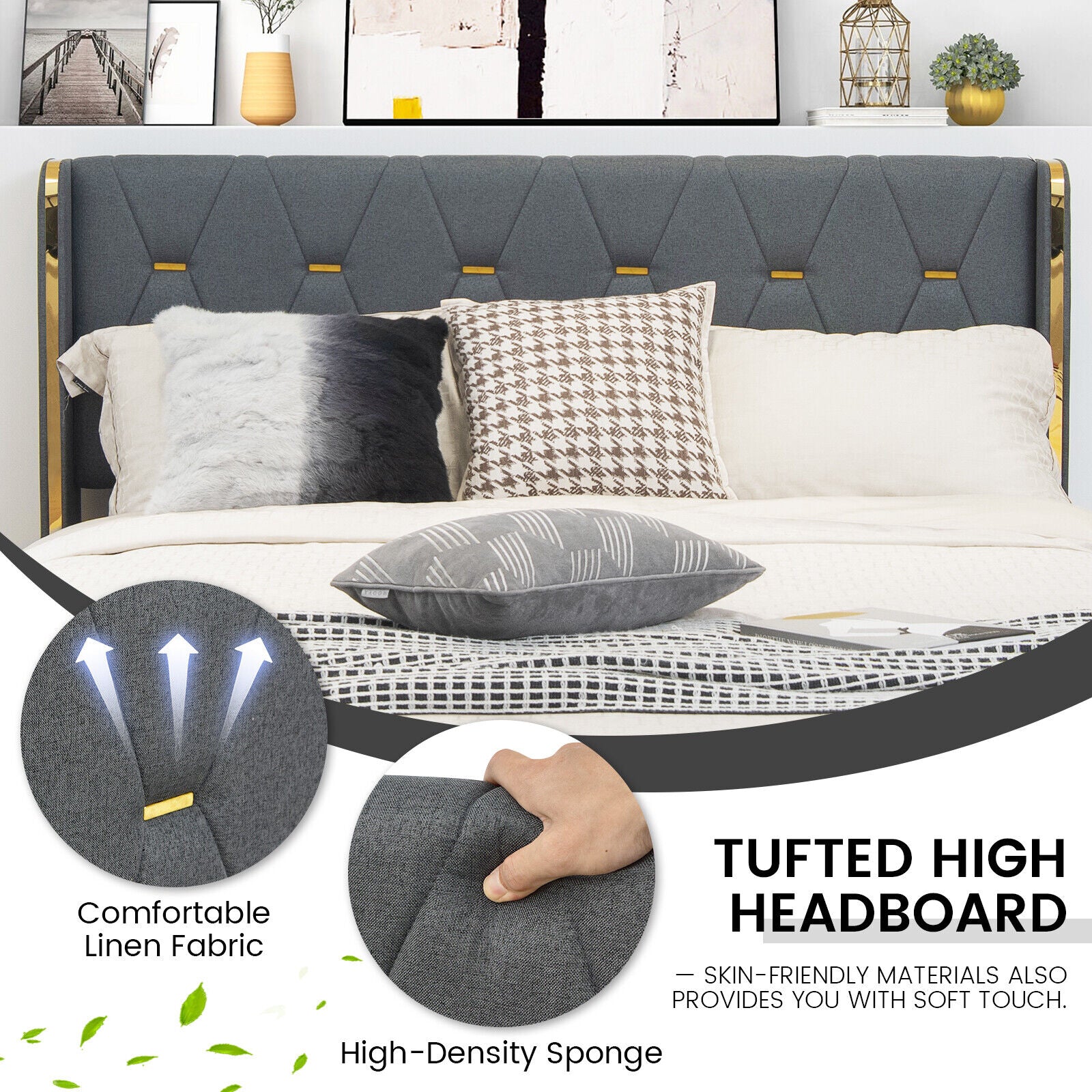 Transform your bedroom with this luxurious platform bed featuring a high headboard, offering lavish comfort and smart storage. The bed frame combines a soft linen and sponge upholstery with a sturdy steel structure, supporting up to 660 lbs. Enjoy quiet, wobble-free sleep thanks to a mute bar and anti-slip pads, plus easy assembly for a stylish, functional addition to any home.
