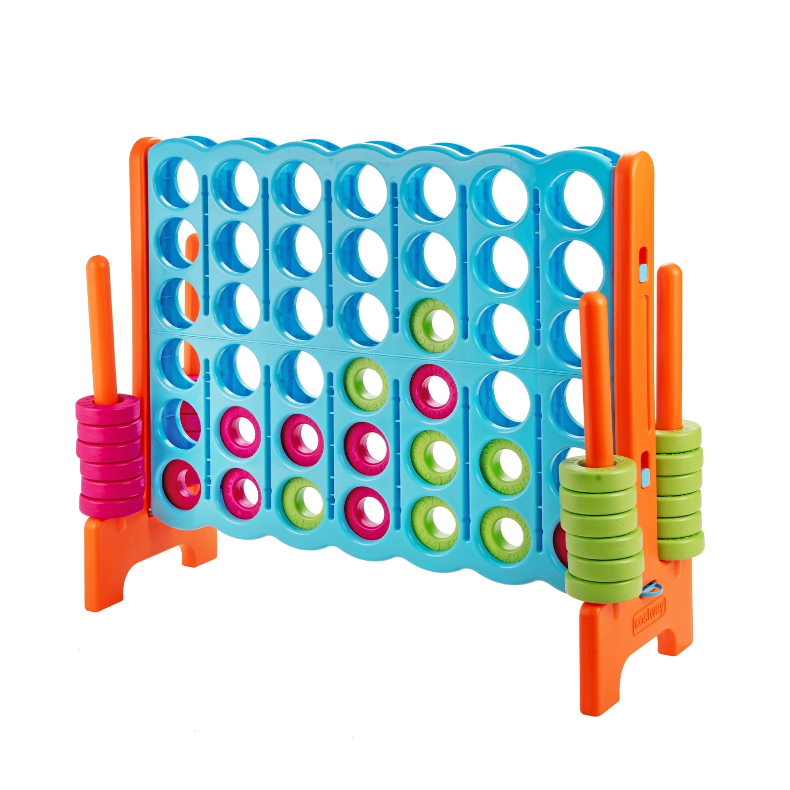 This giant 4-to-score game set is a colorful, lightweight, and durable outdoor and indoor activity that enhances children's motor skills, hand-eye coordination, and cognitive abilities. Perfect for family game nights, parties, or as a holiday gift, it features easy assembly without tools and a simple reset mechanism for endless fun.