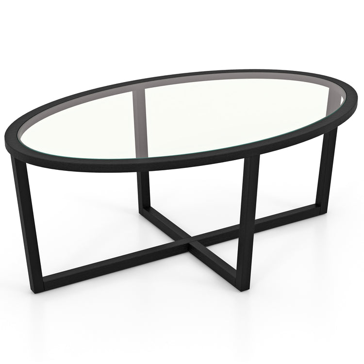 Glass Coffee Table Oval Living Room Table with Cross Base and Acacia Wood Legs, Black