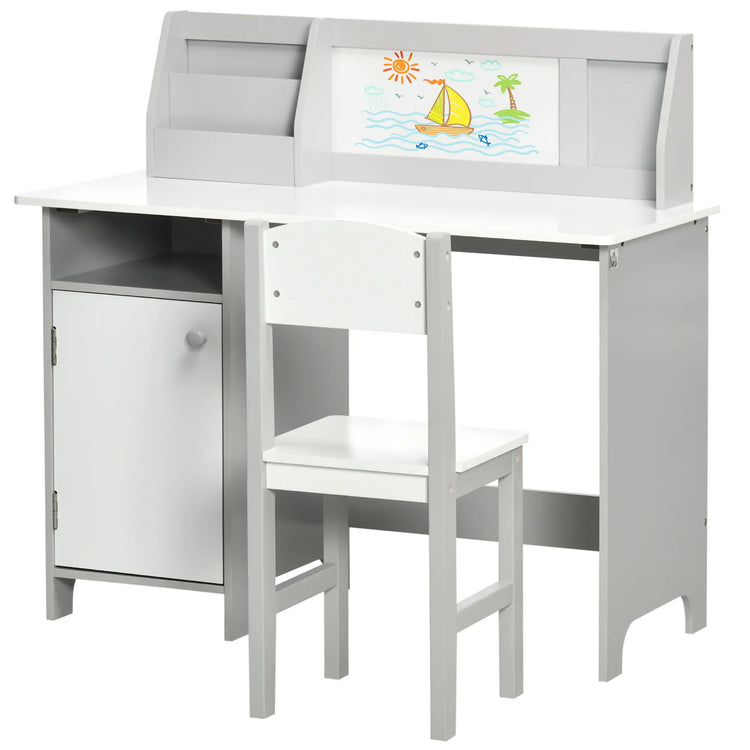Kids Desk and Chair Set, 2Pcs, with Whiteboard, Storage, Grey