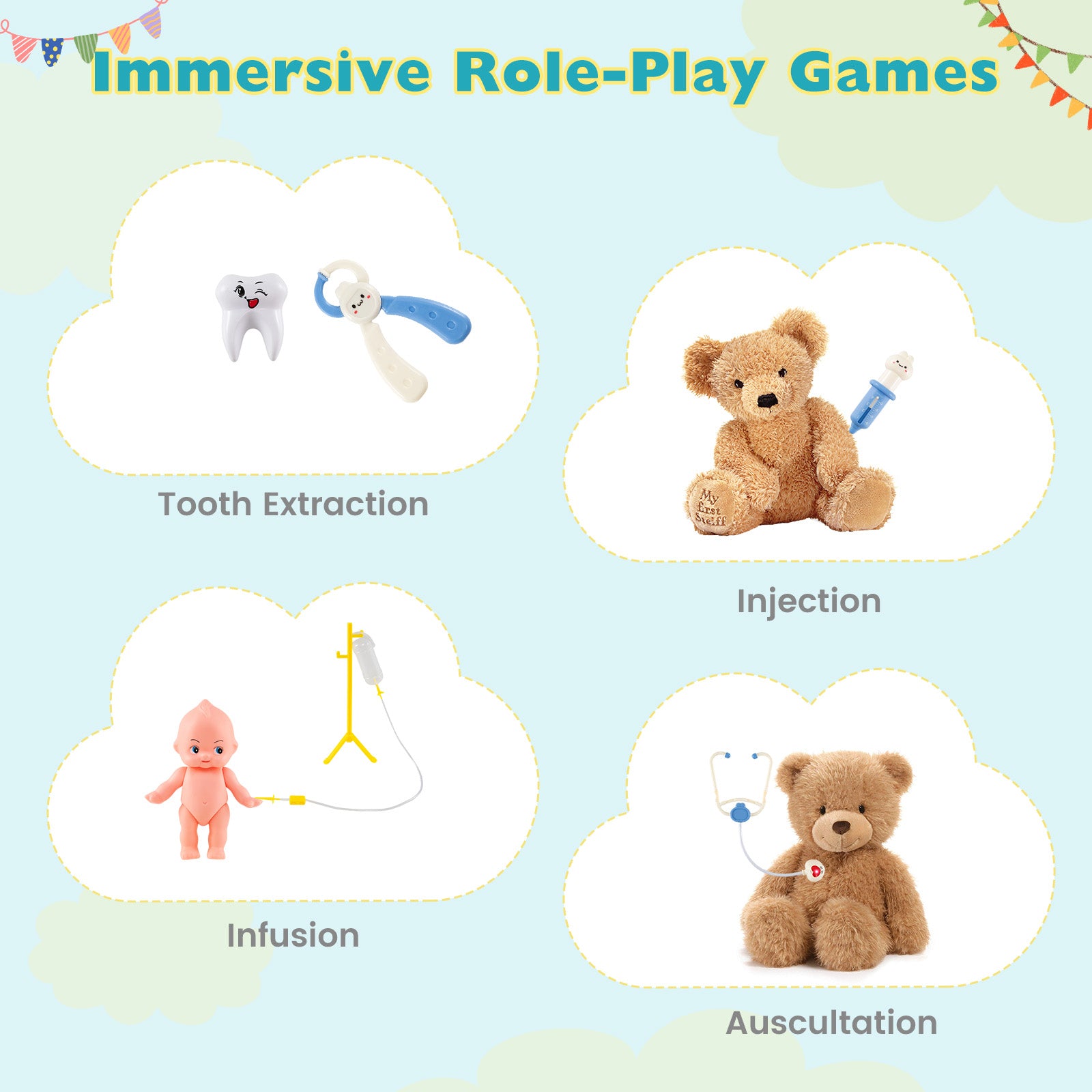 Endless Medical Adventures: Fuel your child's curiosity with 27 diverse medical tools designed for a variety of pretend play scenarios. The pretend doctor kit allows kids to simulate giving injections, perform tooth extractions, set up an infusion, listen to heartbeats with a stethoscope, and more.