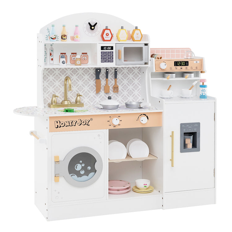 Extensive Role-Playing Areas: The kids kitchen playset boasts various role-playing scenarios – the clock, microwave, washing machine, stoves, sink and faucet. Each element is designed to provide a realistic experience, boosting little chefs' creativity and social skills through interactive play.