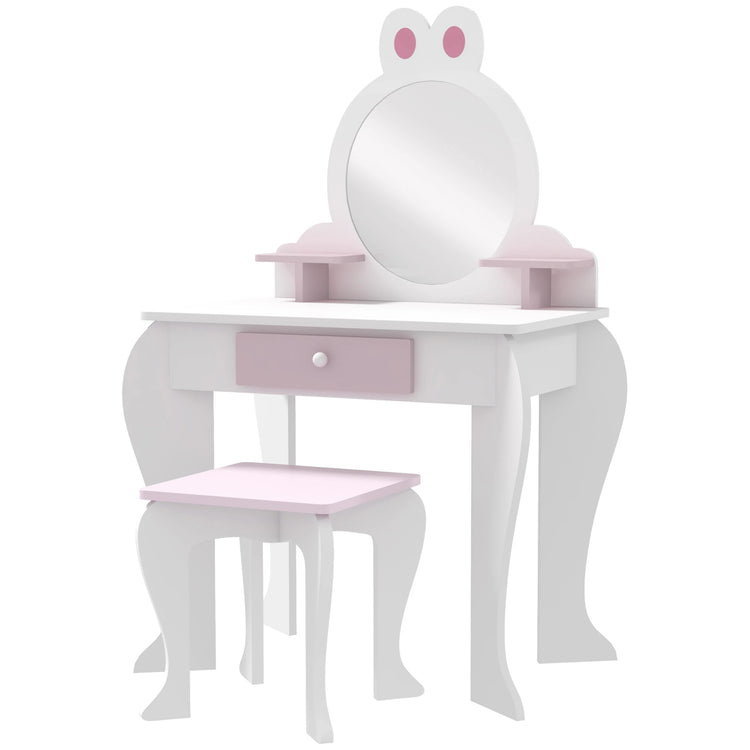 - Includes a vanity table, stool, and mirror for a complete makeup experience.