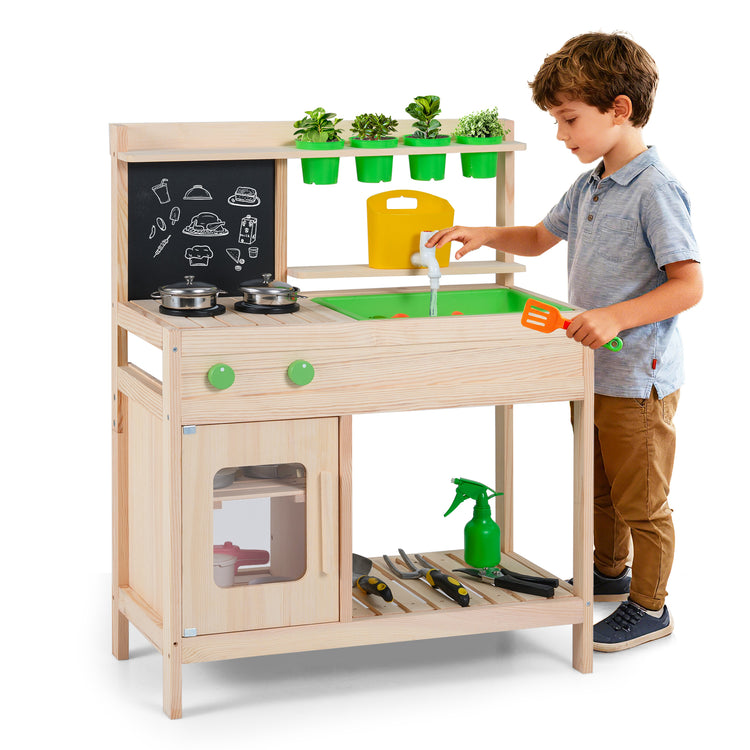 Kids Mud Kitchen Play Pretend Kitchen with Chalkboard for Kids Aged 3+