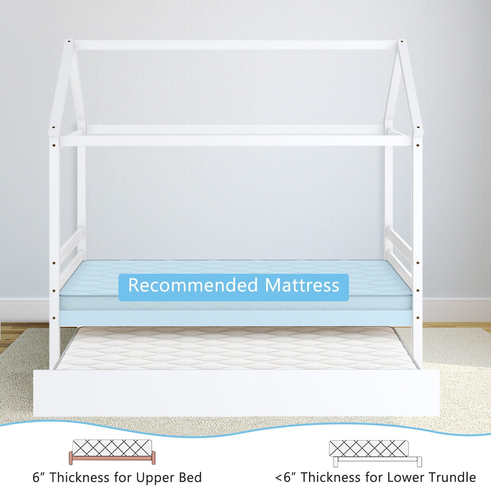 Note of House Bed: Accessories are provided, allowing for convenient assembly. The recommended mattress thickness for twin bed is 6" and thickness of mattress placed on trundle should lower than 6". With evenly located plywood slats, we are sure kids will sleep very stably.