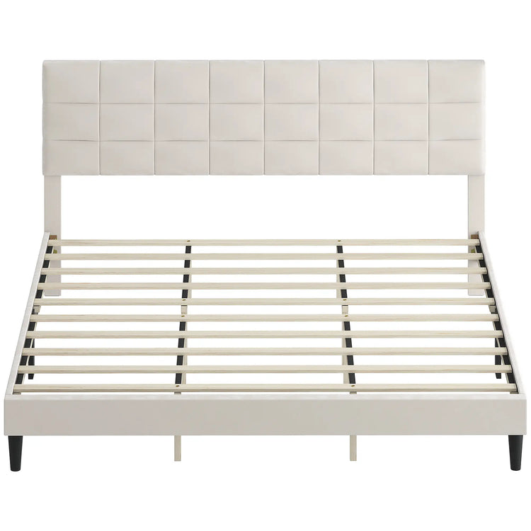 King Size Bed Frame, Upholstered Headboard, Wood Slats, 1100 lbs, Cream