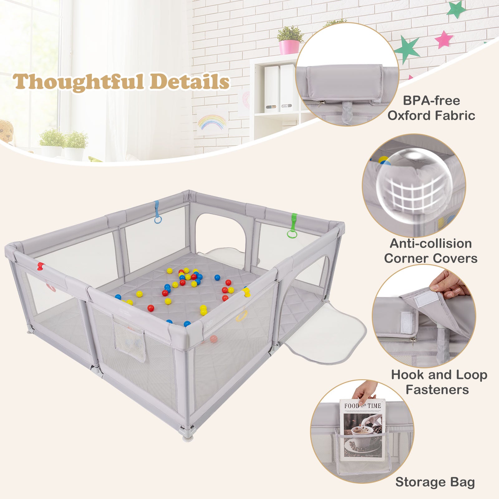Large Baby Playpen with Mat with Pull Rings and Ocean Balls-GR, Gray