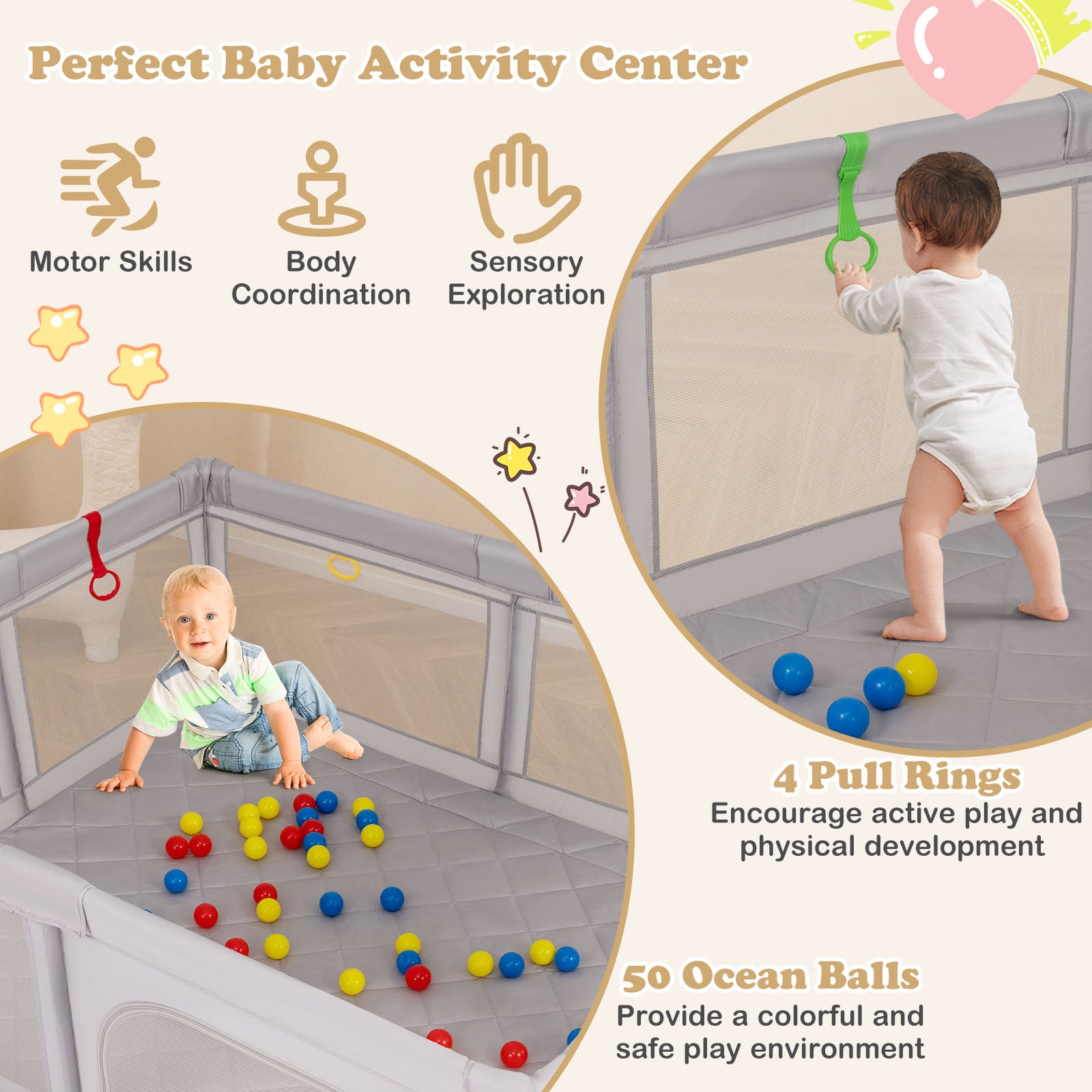 Perfect Baby Activity Center: This spacious baby playpen, measuring 73"L x 61.5"W x 27"H, comes with exciting accessories that keep kids entertained for hours. 4 pull rings encourage active play and physical development, while 50 ocean balls provide a colorful and safe play space for your child.Safety Comes First: Our baby play yard is designed with your child's security in mind. The external zipper design allows only adults to open and close the doors, preventing kids from wandering out unsupervised. The breathable mesh walls create a safe enclosure while ensuring clear visibility, so you can always keep an eye on your baby.
