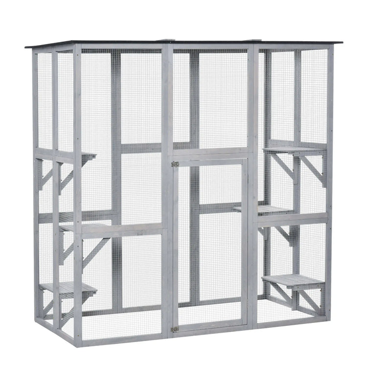 Large Outdoor Catio Enclosure, Weatherproof Cat House, Wooden Patio Cage, 6 Platforms, 71" x 39" x 71", Grey