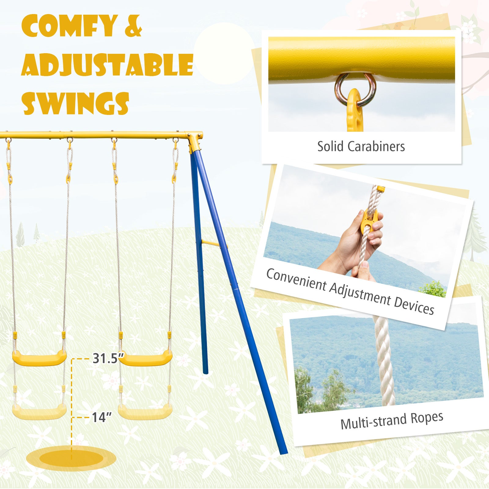 - Convenient adjustment devices to easily alter the swings' height