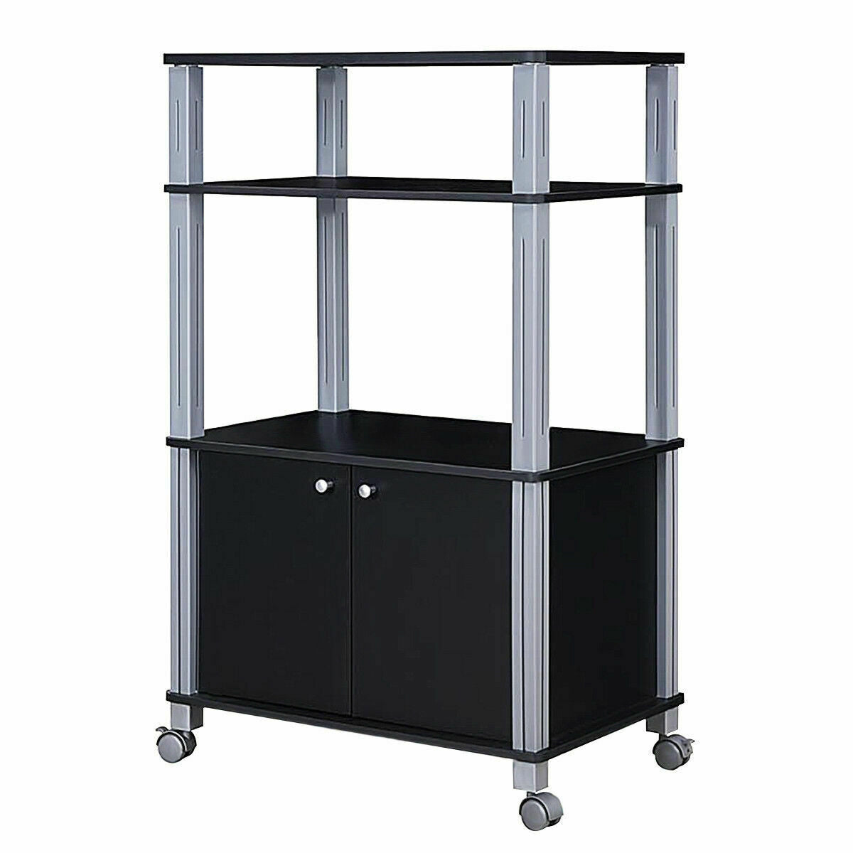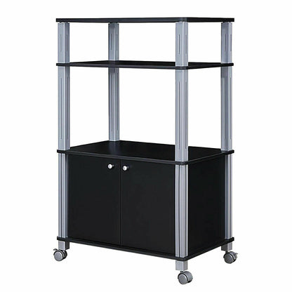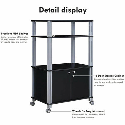 • Ample storage space with 3 shelves and a 2-door storage cabinet to accommodate microwave ovens, dishes, and other items.
