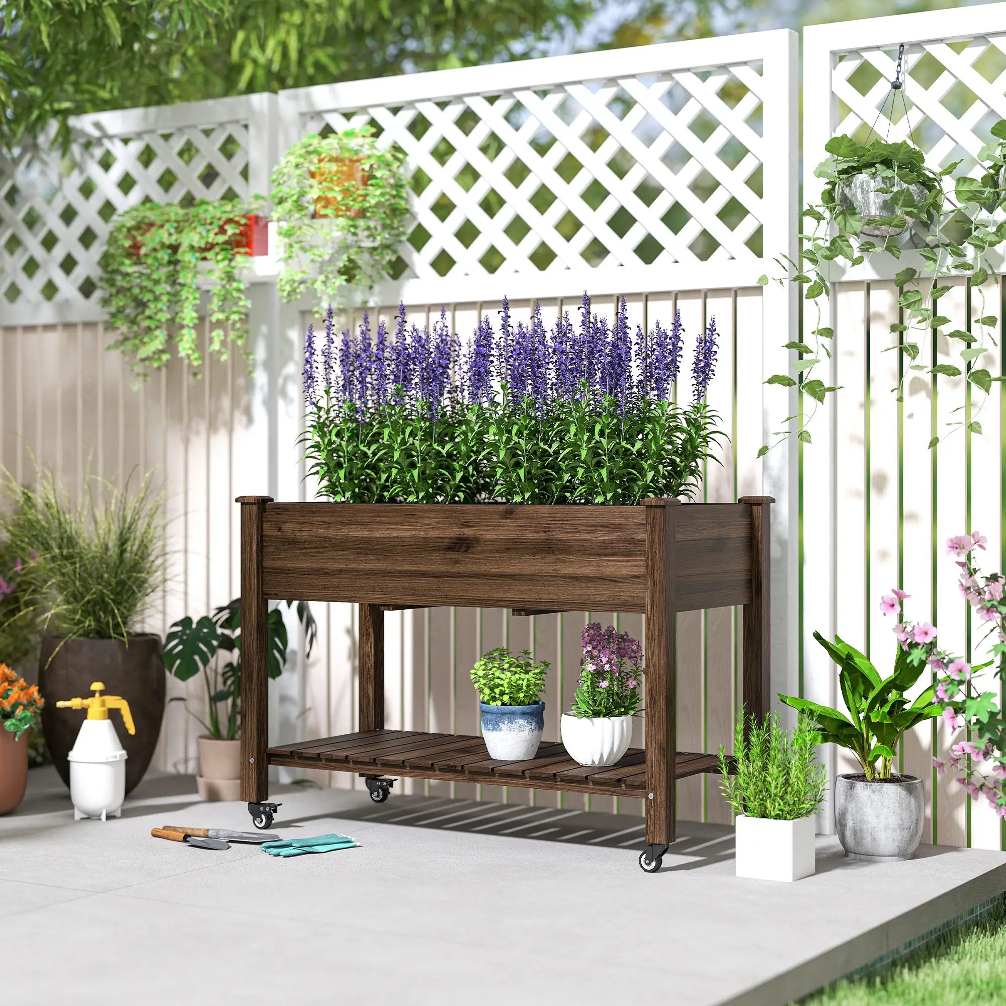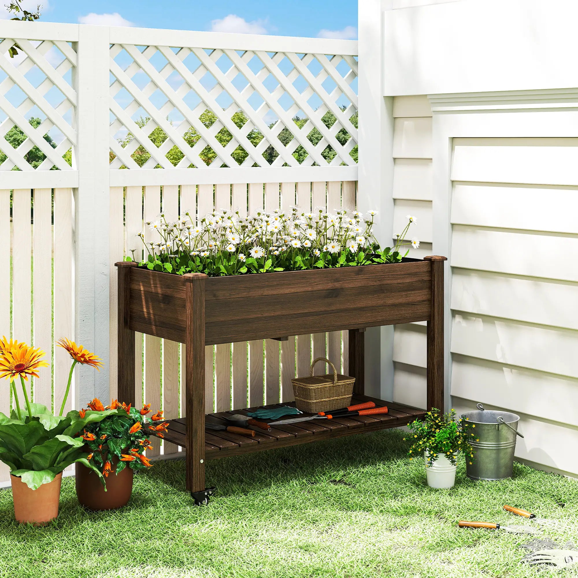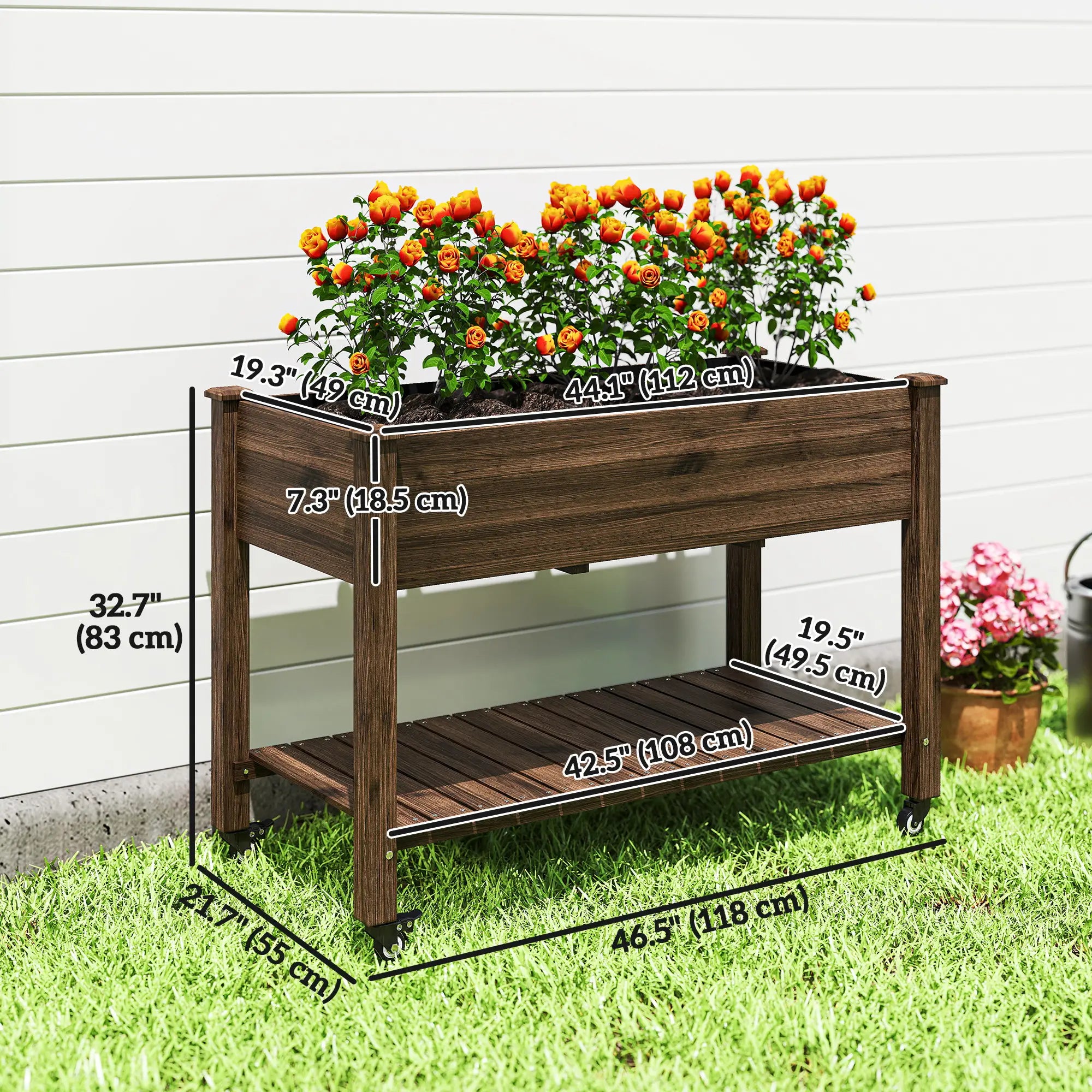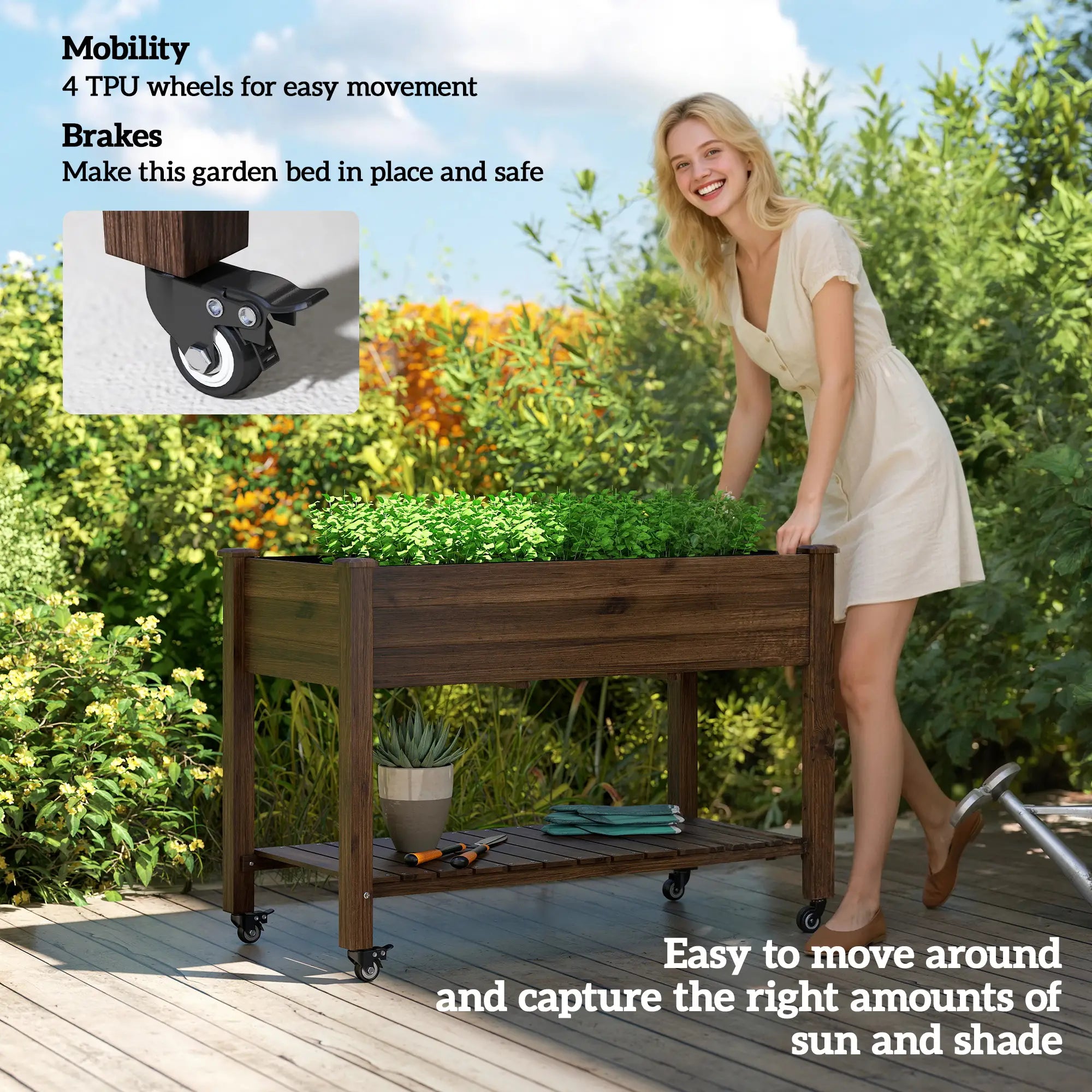 Mobile Raised Garden Bed, Elevated Wood Planter Box, Lockable Wheels, Storage Shelf, Carbonized
