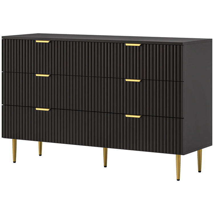 Transform your bedroom with this stylish and functional black chest of drawers, featuring six spacious drawers for optimal storage. Perfect for organizing clothes, accessories, and more, this modern dresser combines elegance with practicality. Its fluted door panels and gold handles add a luxurious touch, while the anti-tipping design ensures safety and stability.