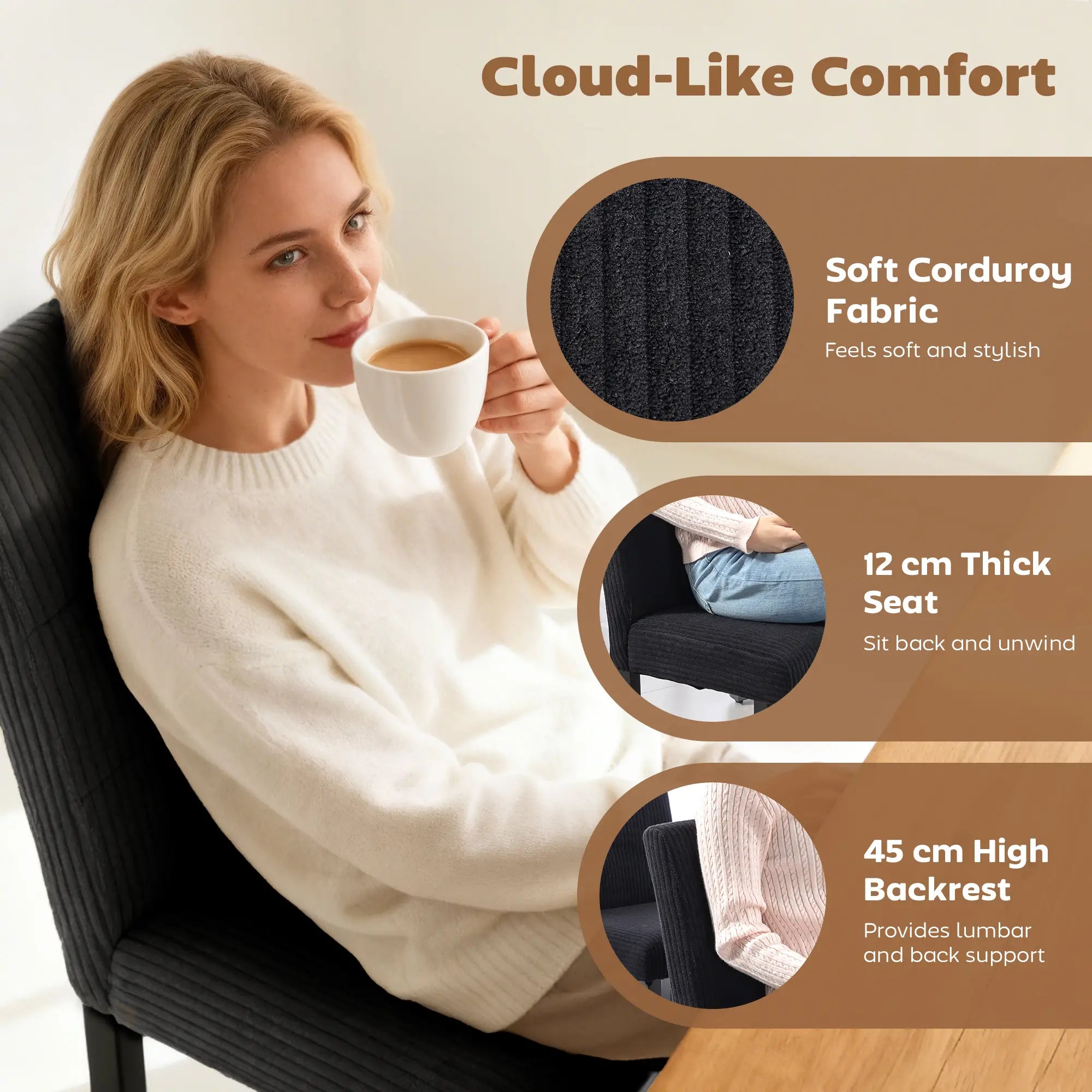 - Features an extra-thick 4.7-inch sponge seat for luxurious, cloud-like comfort during long meals and cozy gatherings.
