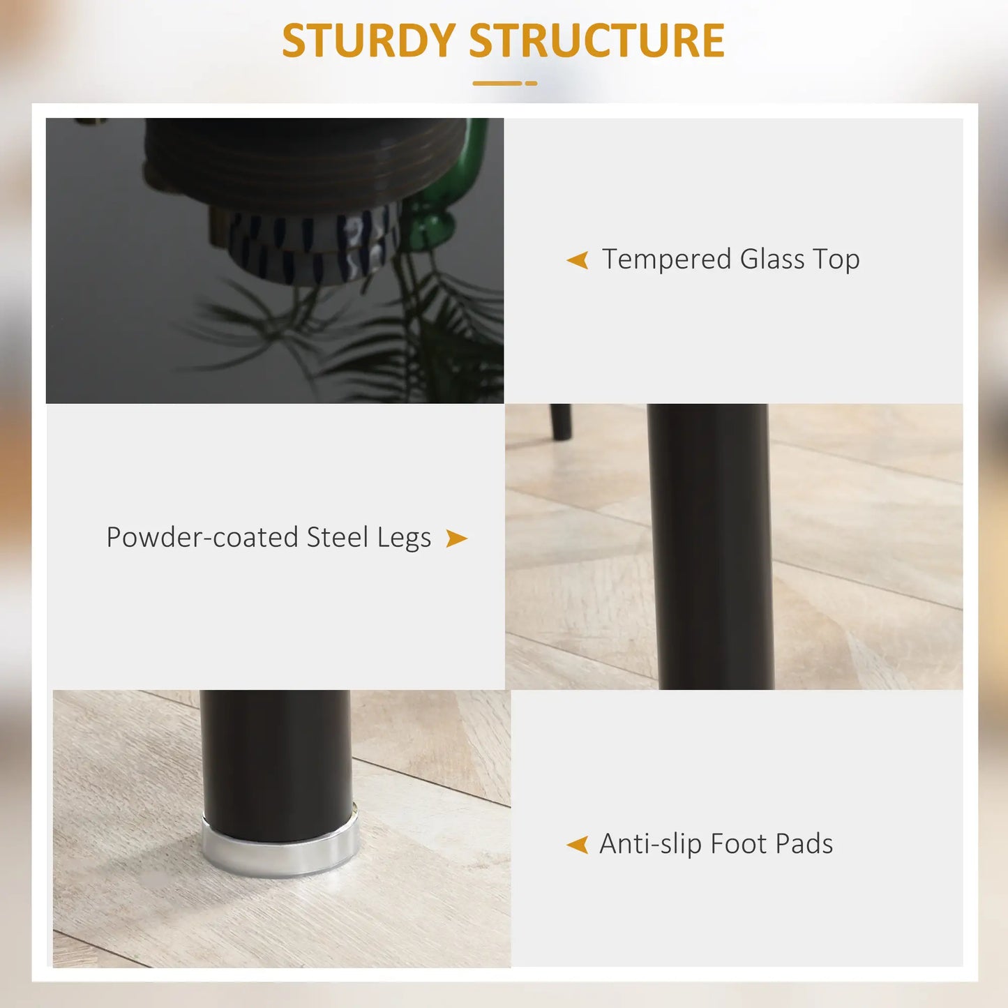 - Tempered glass tabletop and powder-coated steel frame for durability