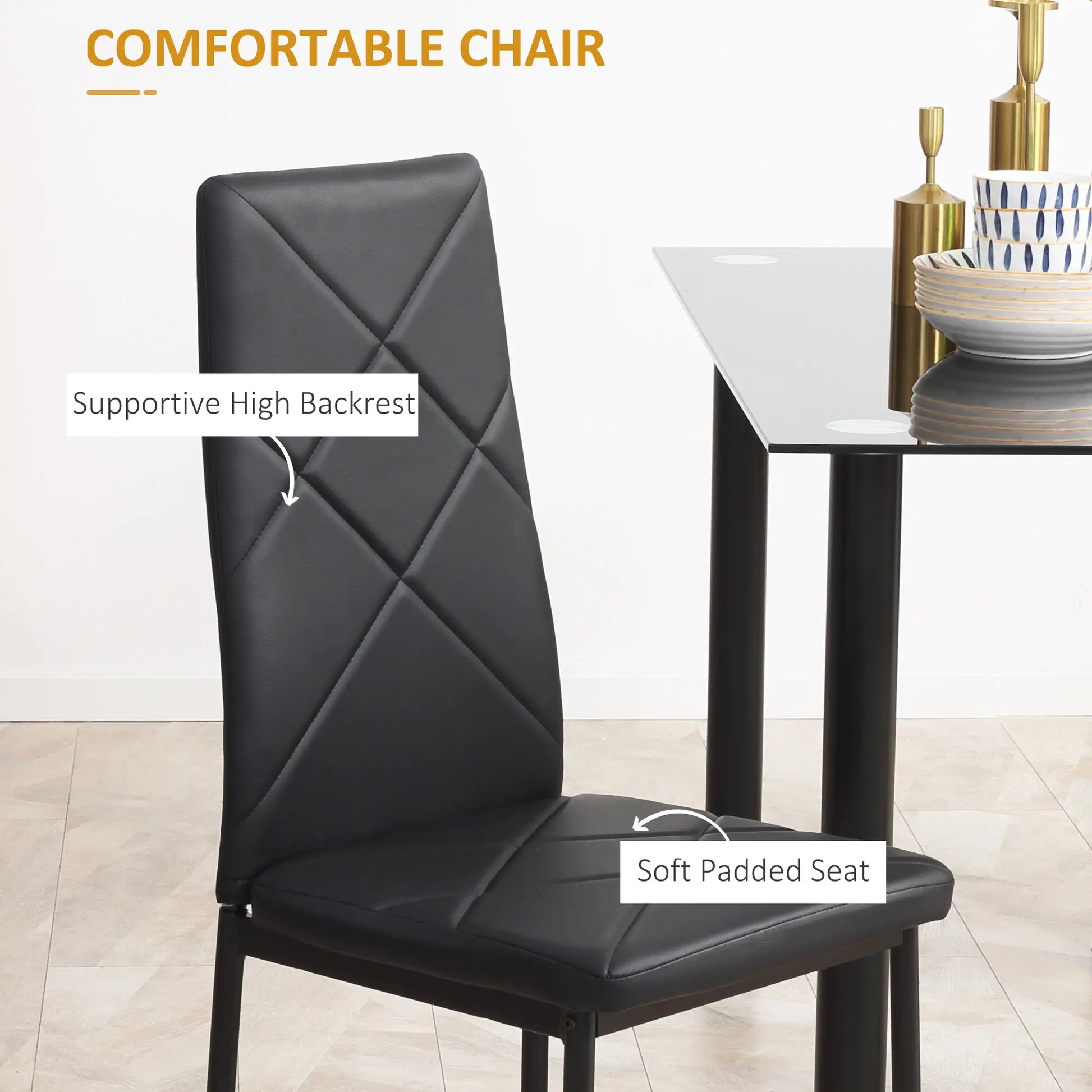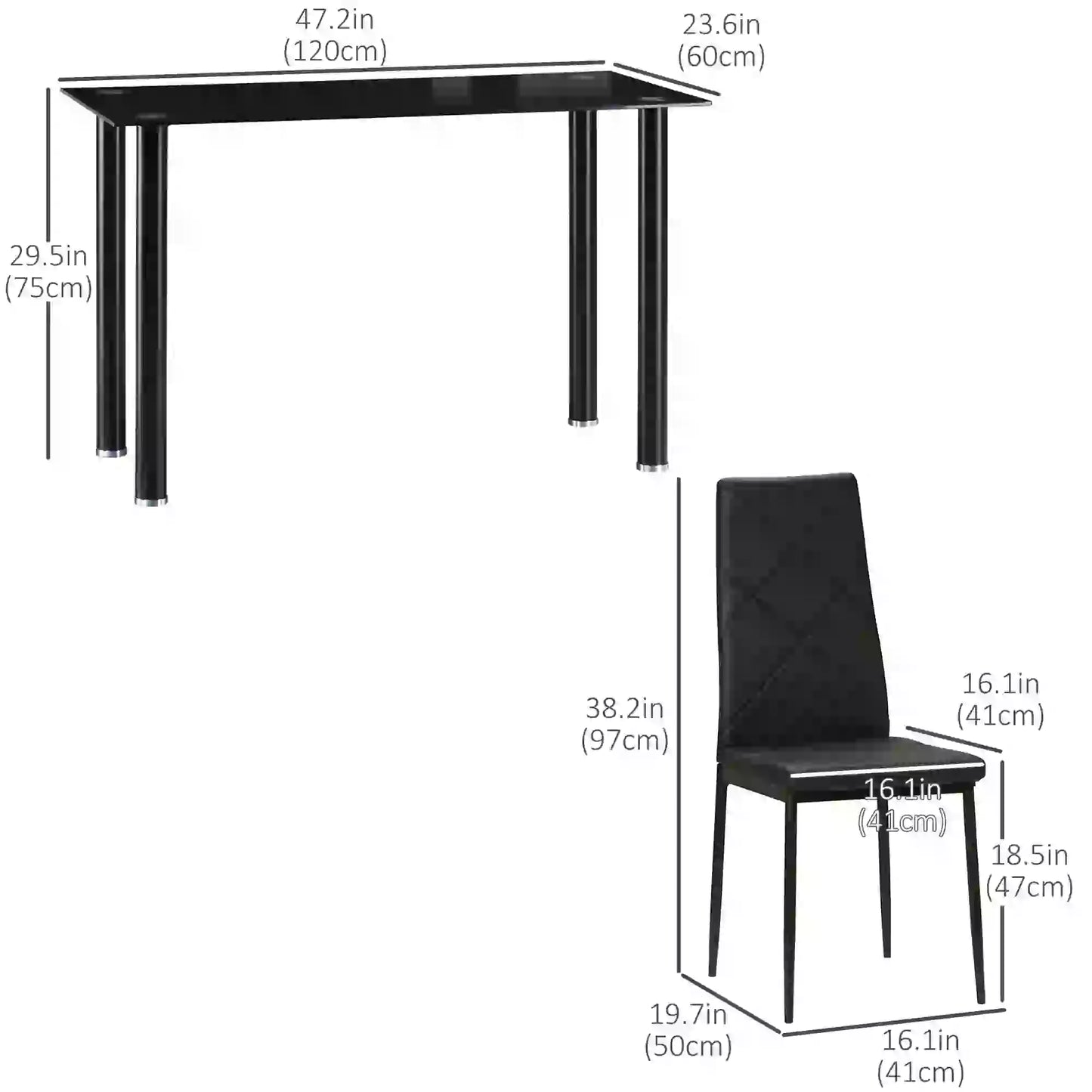 Transform your dining area with this elegant 5-piece kitchen table set, perfect for family meals and gatherings. Designed for comfort and durability, it features a modern black finish, tempered glass tabletop, and PU leather chairs with thick foam padding for ultimate relaxation. Ideal for small spaces, the armless chairs easily tuck under the table. Assembly required.