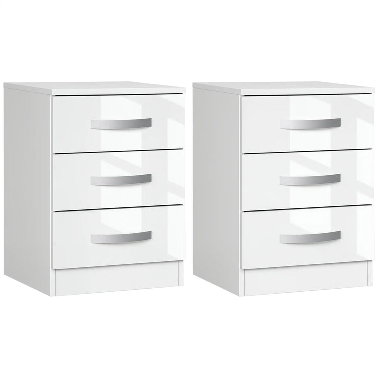 Enhance your bedroom or living room with these modern, white nightstands featuring high-gloss fronts and three spacious drawers for ample storage. Perfect for displaying decorations and organizing essentials, this set of two offers both style and functionality.