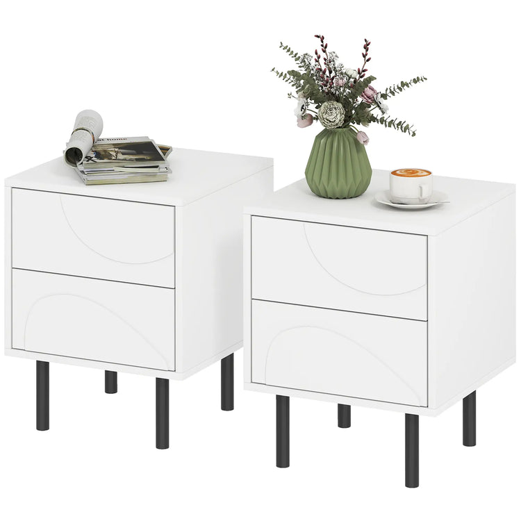 Elevate your bedroom decor with this elegant set of two bedside tables, featuring push-to-open drawers for quiet, safe access. Perfect for modern homes, these nightstands offer spacious storage and a sleek white finish with black metal legs for a minimalist look.