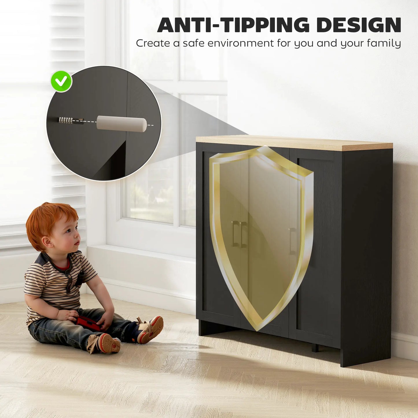 Enhance your kitchen or living room with this modern buffet cabinet, offering spacious storage and a sleek design. Perfect for organizing dishes, utensils, and more, its adjustable shelves and anti-tipping feature ensure safety and versatility.
