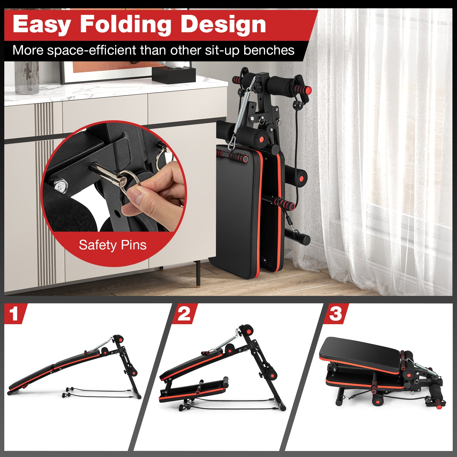 Professional Exercise Bench: Equipped with a spring handle, pull up bar and 2 elastic ropes, this 8-in-1 sit up bench enables you to engage in a comprehensive full-body workout with maximum efficiency. Plus, you have the flexibility to participate in a variety of activities, including rope pulling, sit ups, spring assisted movement, leg training, lying leg, roll ups, waist work, push ups, and more.