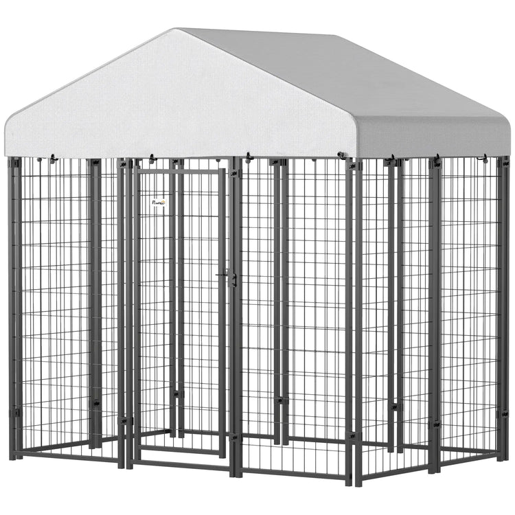 Discover the ultimate outdoor sanctuary for your pets with this durable metal dog kennel, featuring a covered roof for protection against the elements. Its spacious interior and secure design ensure a safe and comfortable environment for your furry friends.