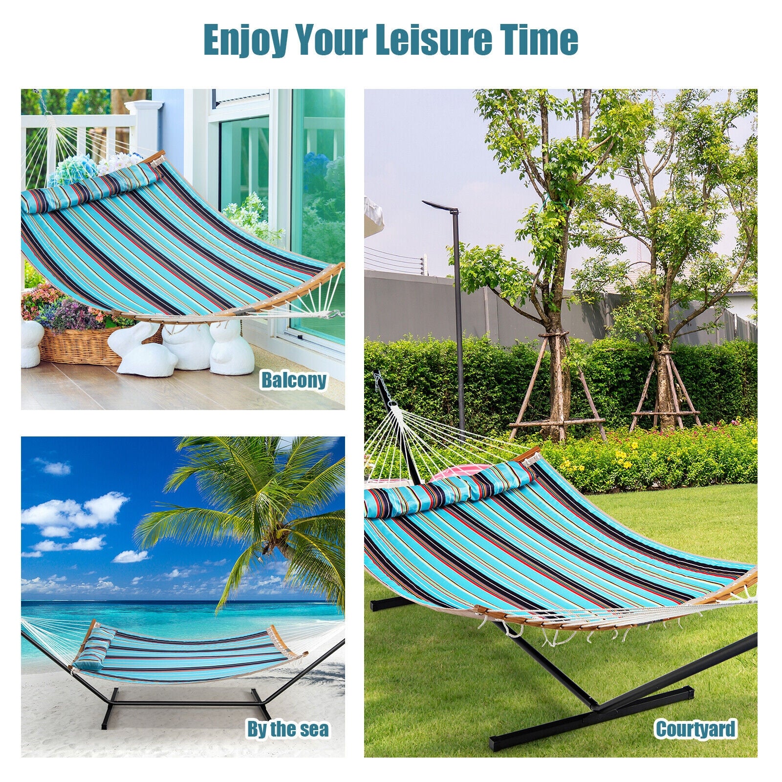 Designed for Comfort: Lay on this hammock made of 2-layer polyester with polyester wadding, your fatigue and tension of a tiring day can be eased. Additionally, this cozy hammock comes with a detachable pillow with fixed ropes, allowing you to attach it to the spreader bar according to your need and bringing extra comfort.