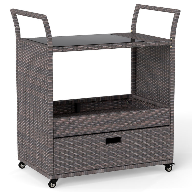 Outdoor Wicker Bar Cart Table with Tempered Glass Top
