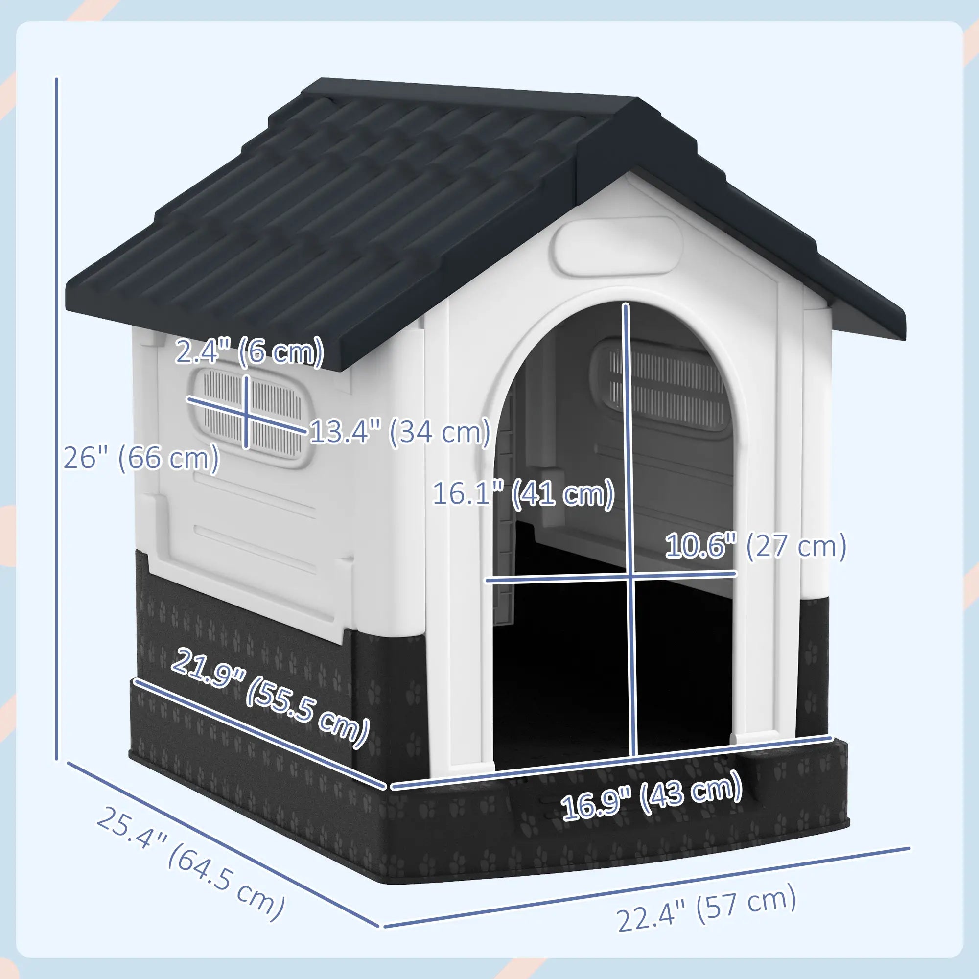 - Overall dimensions including roof: 25.4" L x 22.4" W x 26" H (64.5 cm x 57 cm x 66 cm).