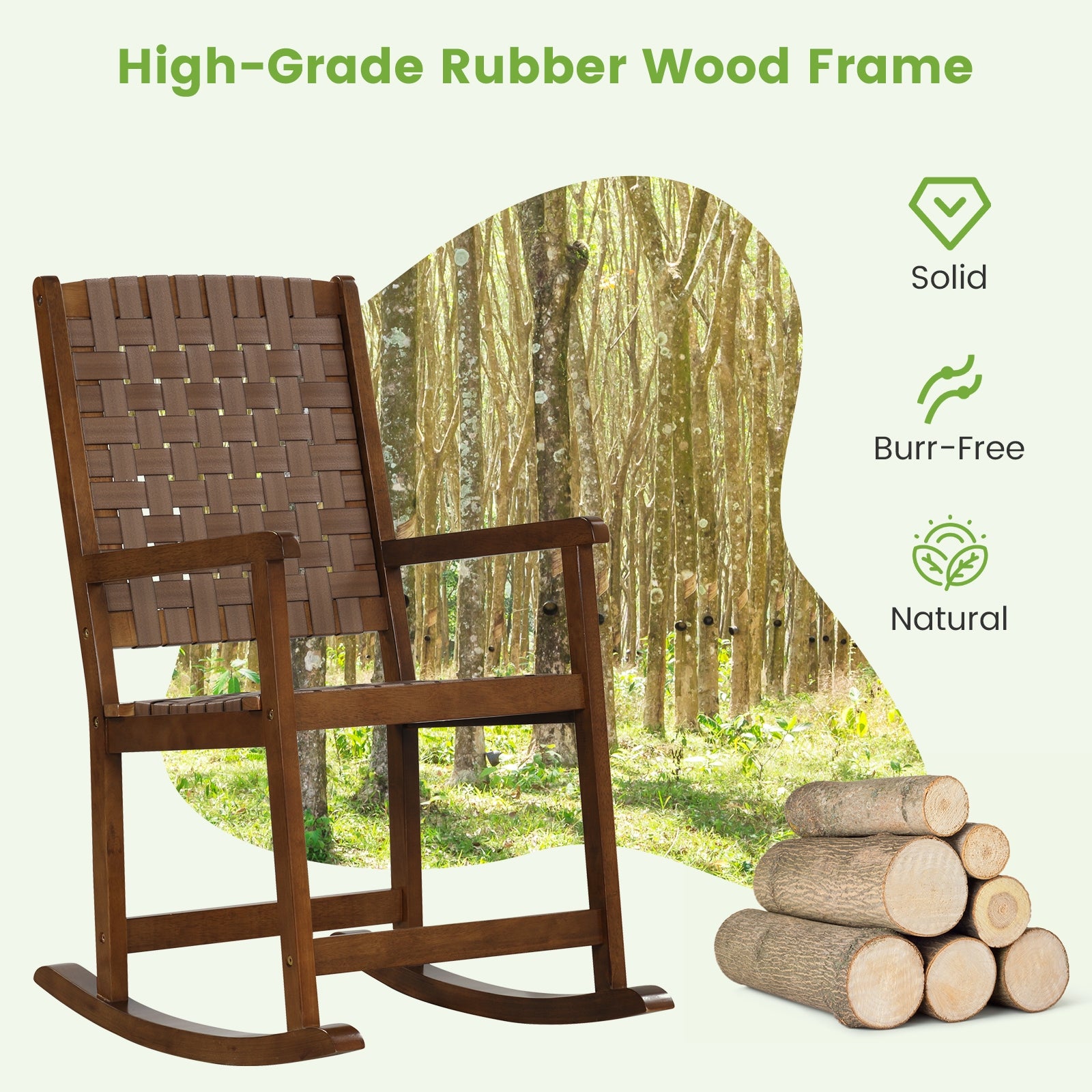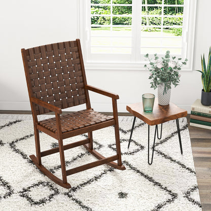 Patio Wood Rocking Chair, PU Seat, Rubber Wood Frame, Brown