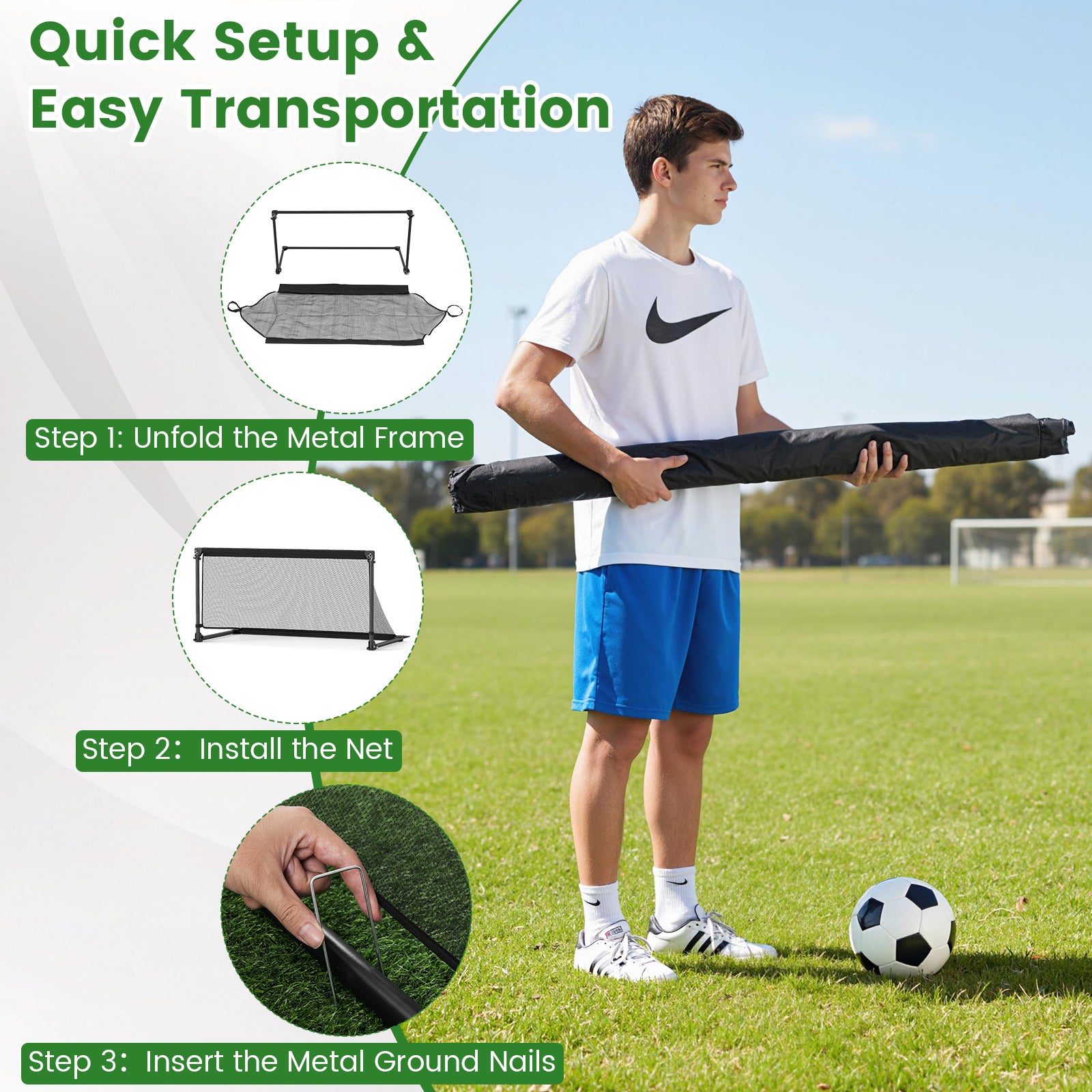 Stable & Sturdy Construction: This portable soccer goal features a heavy-duty frame made from powder-coated metal pipes for ultimate sturdiness. Moreover, it is reinforced with spring locks, quick-release pins, and U-shaped ground stakes to ensure optimal security and steadiness.High-Quality Materials: Crafted from premium PE net and high-strength oxford fabric, this soccer net offers tear-resistant and resilient performance for long-lasting durability. Plus, it stands up to intense practice, making it the perfect choice for young athletes who play hard.