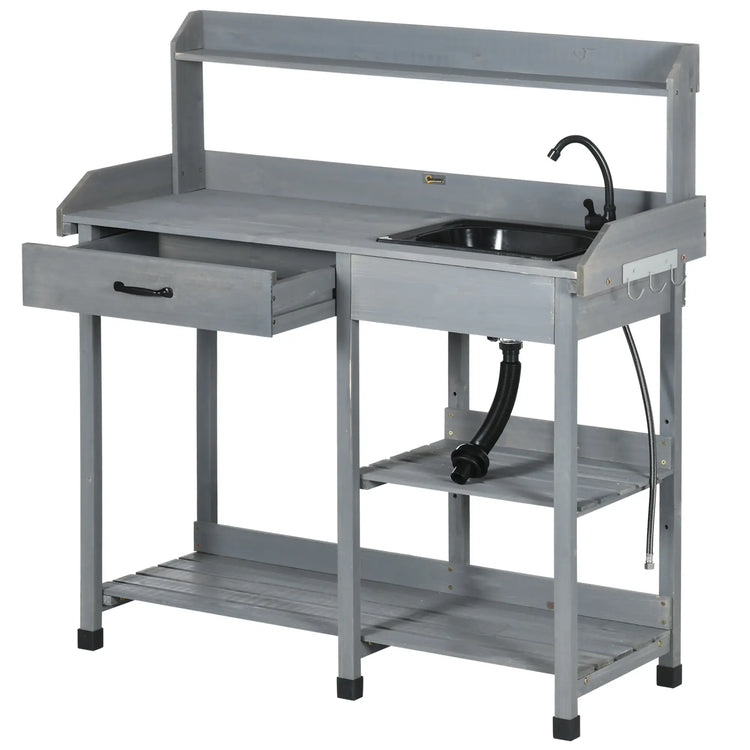 This versatile potting bench combines natural solid wood construction with flexible functionality for all your gardening needs. Featuring a removable sink, ample storage with shelves and drawer, and ergonomic design, it's the perfect addition to any outdoor space for potting plants, organizing tools, and creating a convenient workstation.