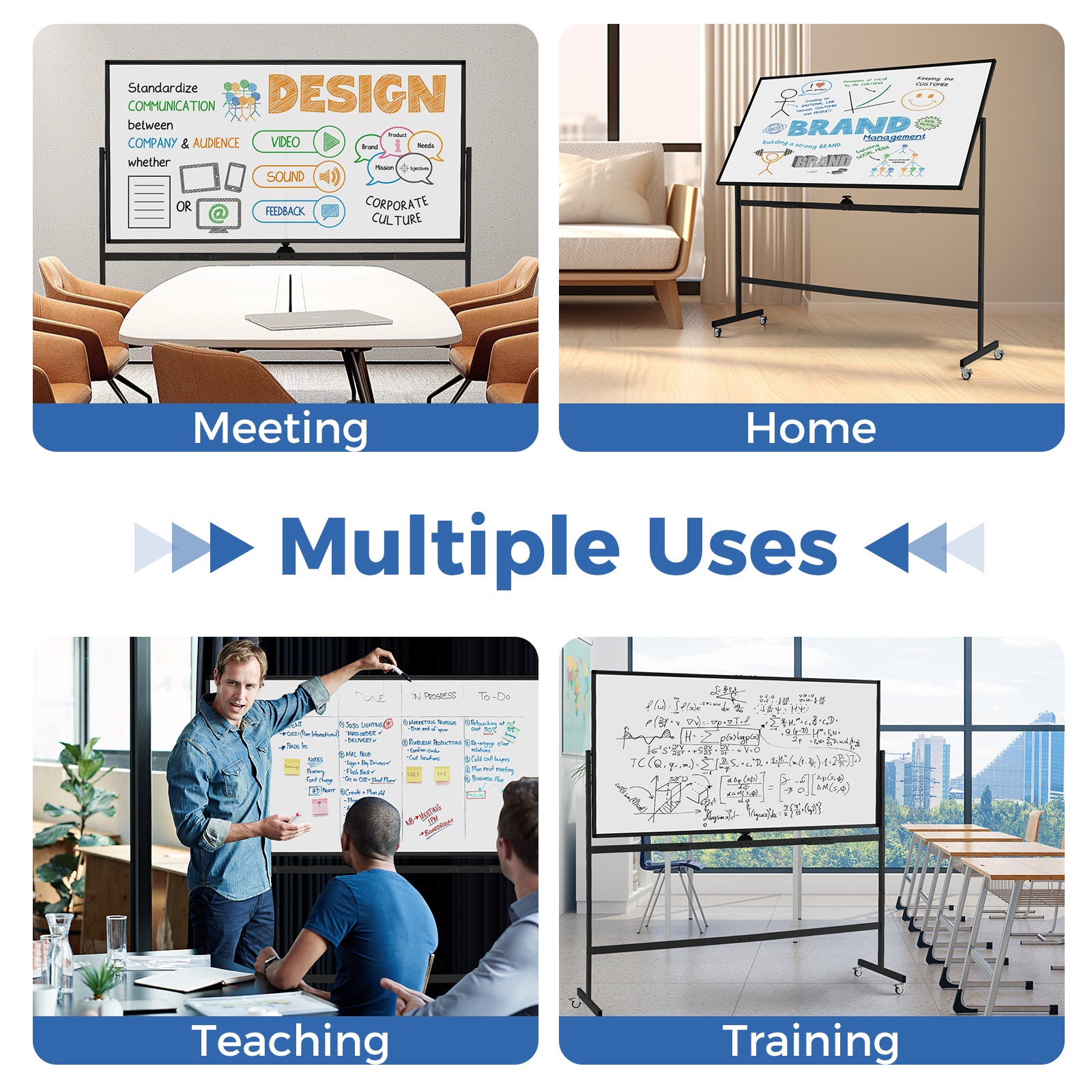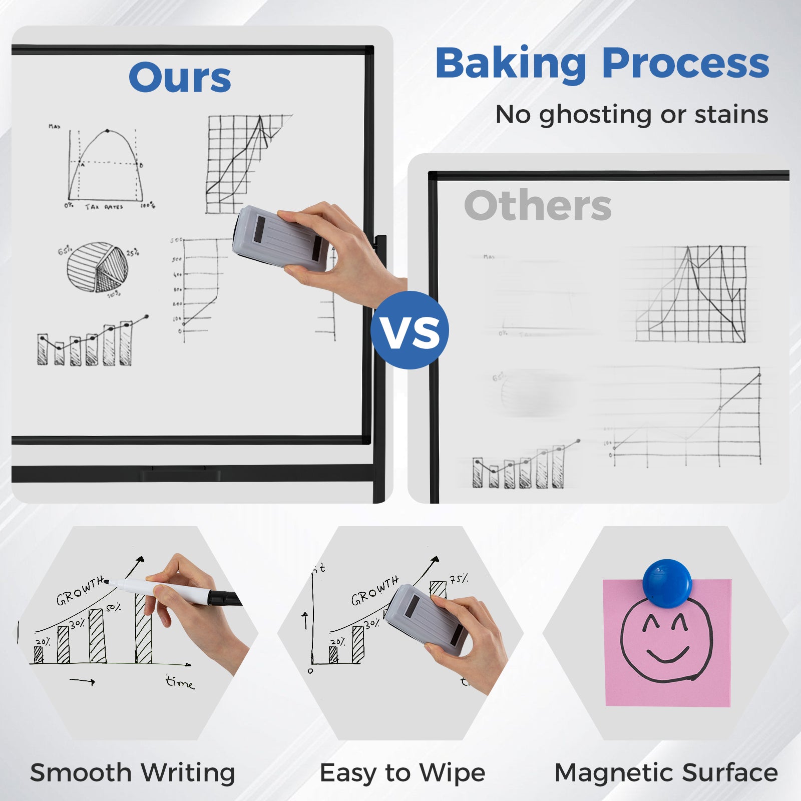 Double-sided Writing: Featuring a 72" ×36" double-sided magnetic whiteboard, it allows for continuous usage without interruptions. Effortlessly rotate it 360° and use the convenient swing stopper to quickly secure the board in place, ensuring stability during writing or presentations.