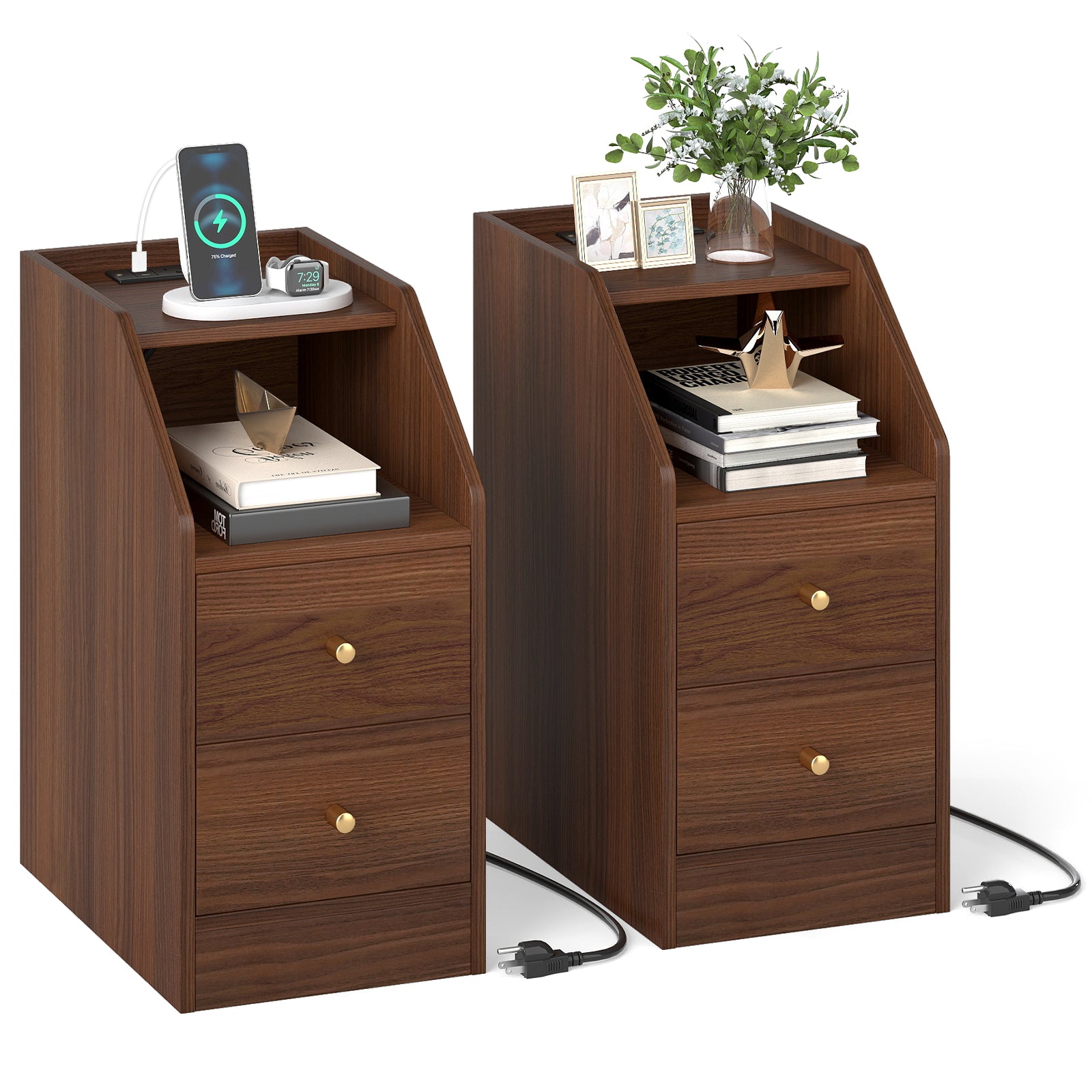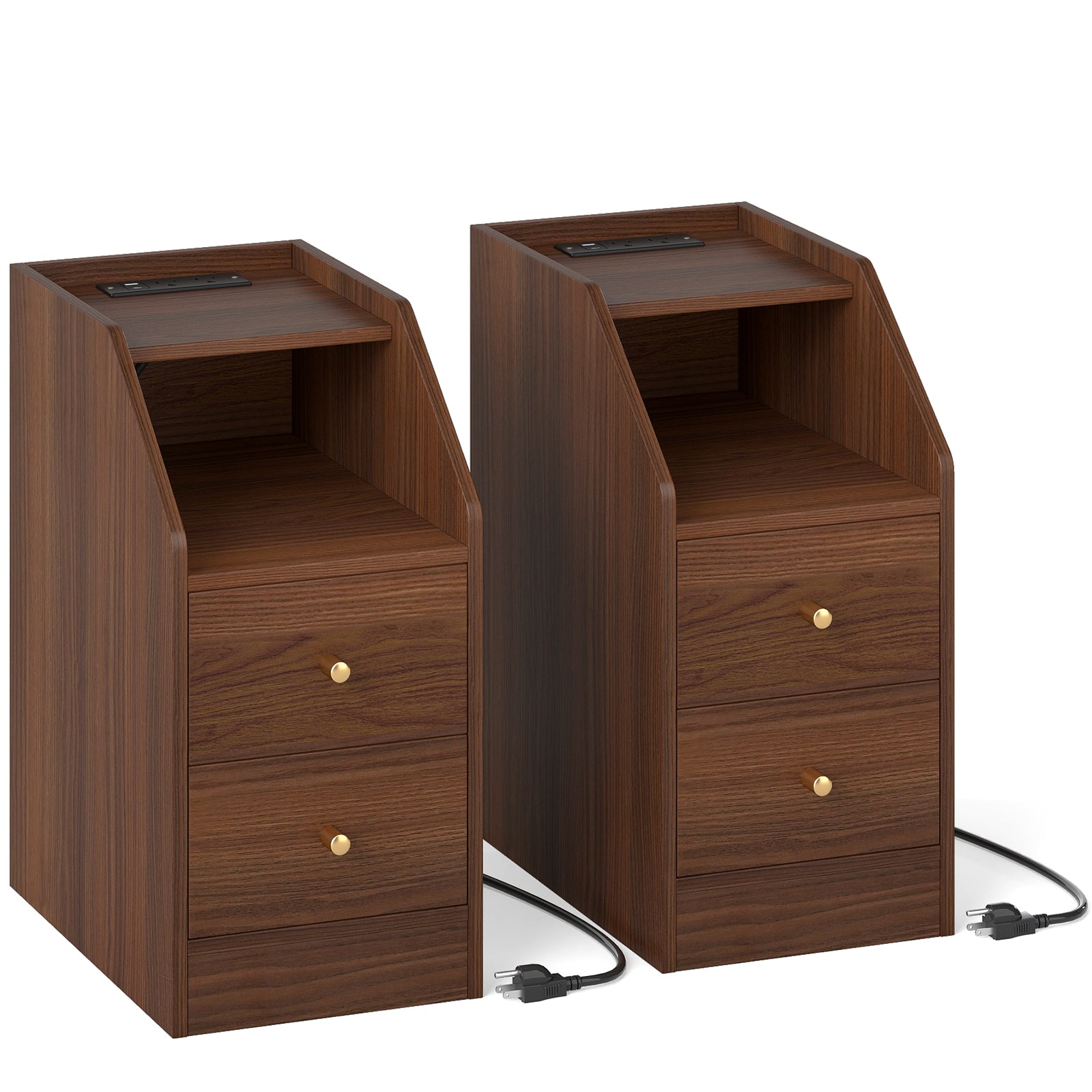 Set of 2 Side End Tables with Charging Station Sofa Couch Tables with Shelf Drawers, Walnut