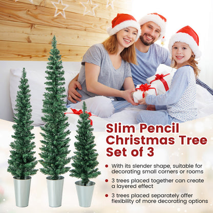 - Set of three artificial Christmas trees with slender pencil shapes for flexible decorating in small spaces.