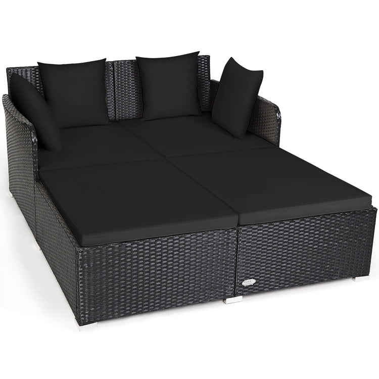 Spacious Outdoor Rattan Daybed with Upholstered Cushions and Pillows, Black