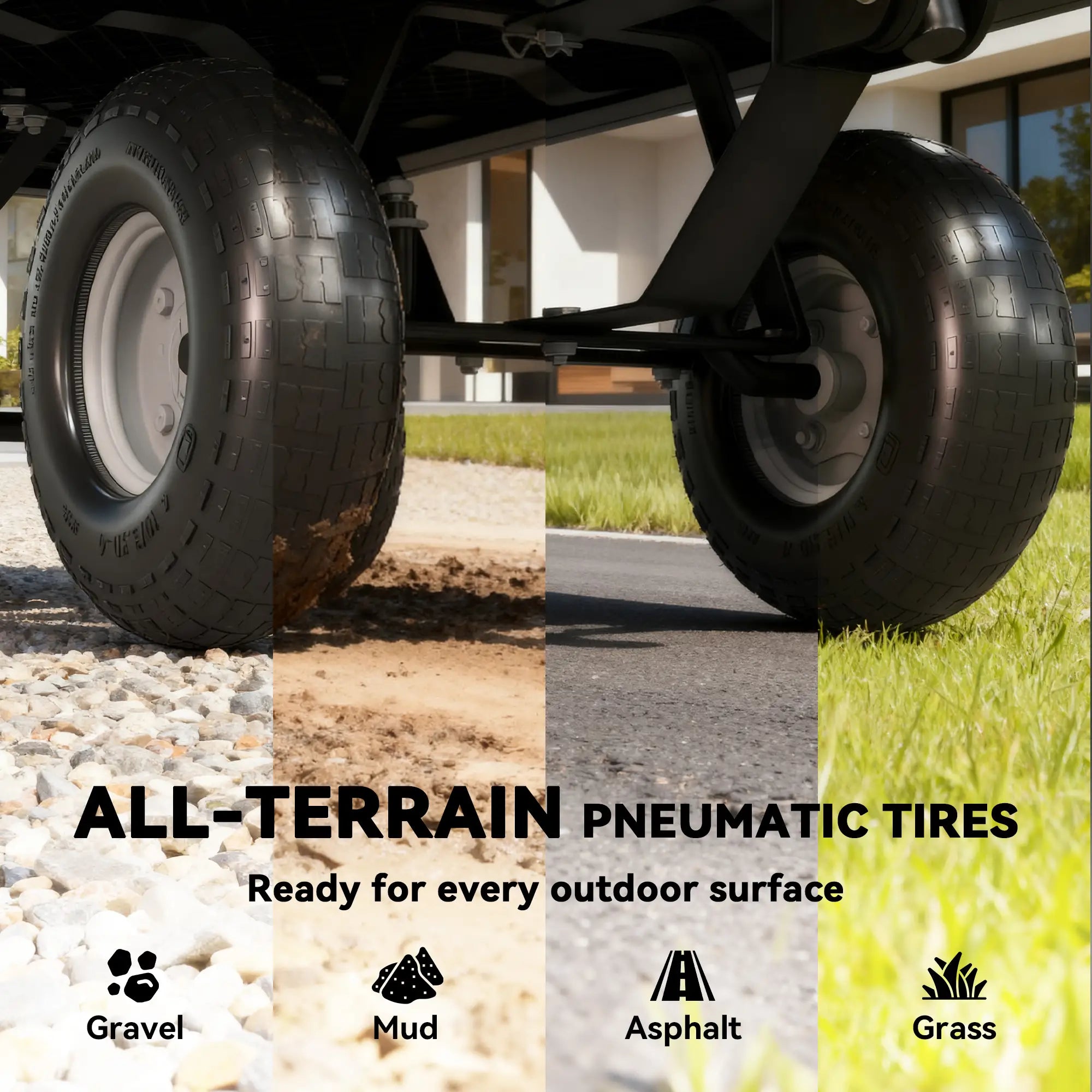 - Equipped with 4 pneumatic rubber wheels, each with a 25 cm diameter.