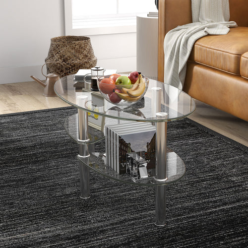 Modern and Compact Appearance: Glass coffee table comes with double shelves and irregular boards. The oval shape looks modern and you can put your tea cups, flowers, and books on the first shelf, the second shelf could be used as a storage shelf. It saves a lot of space.