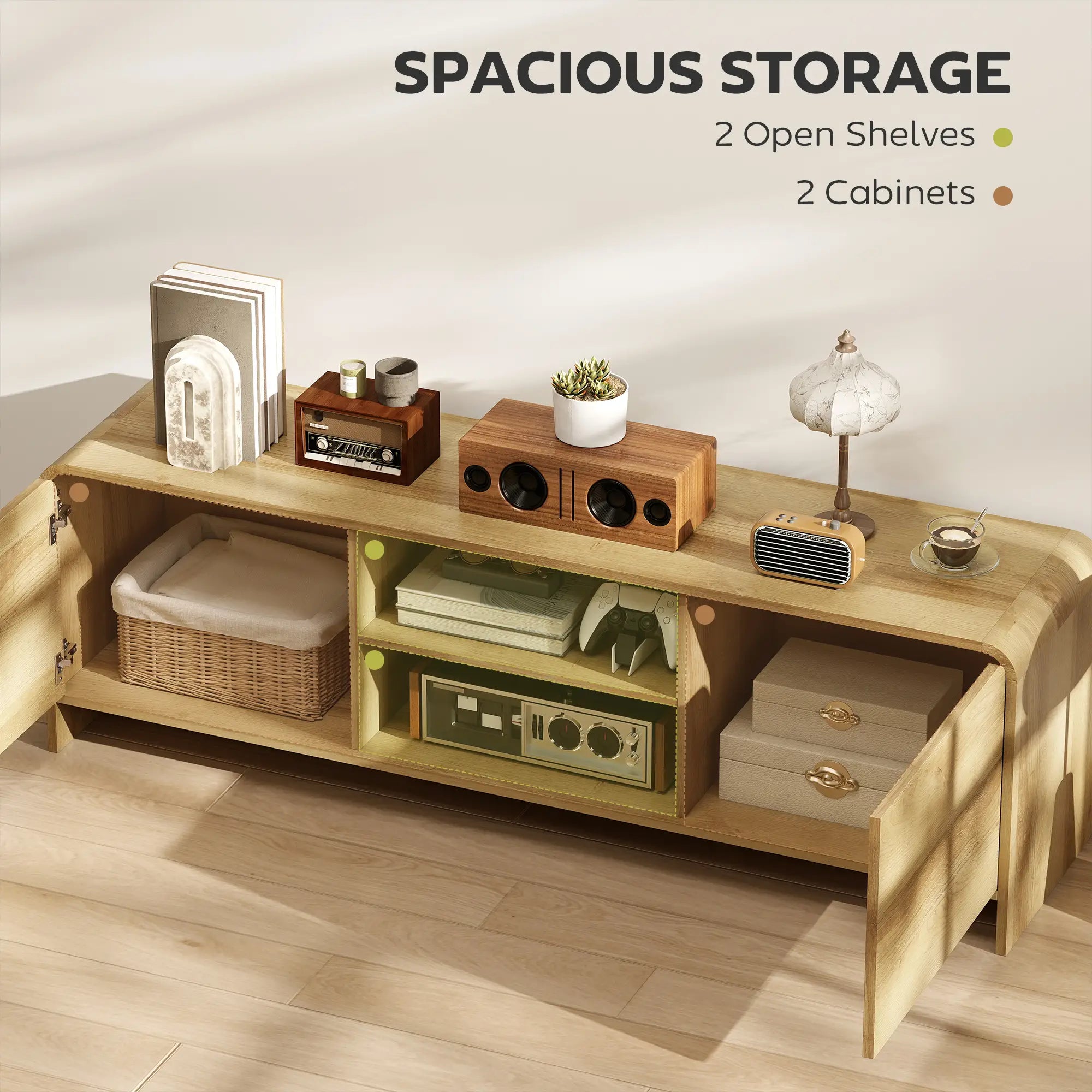 - Flexible Storage Zones: Featuring double cabinets and two open shelves, including a three-level adjustable shelf, this TV console keeps your space organized and clutter-free—great for peaceful evenings and smooth daily routines
