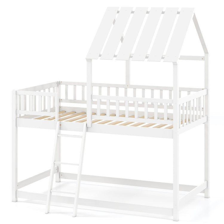 Twin Over Twin House Bunk Bed with Roof and Full-length Guardrails for Kids Teens Boys Girls, White