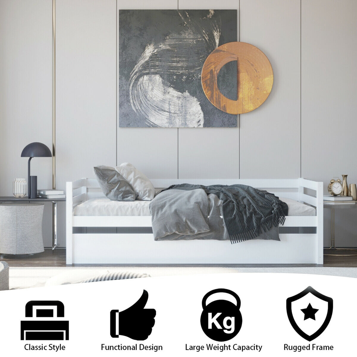 Multifunction daybed can be used as a sofa or 2 twin beds. With solid legs and thick slats, the daybed has a high weight capacity to firmly support your mattress without additional box spring. This daybed with slatted decor has a modern and concise design which can go well with the decoration of your rooms. Combining with reliable quality and premium craftsmanship, it can provide you with excellent comfort while sleeping.