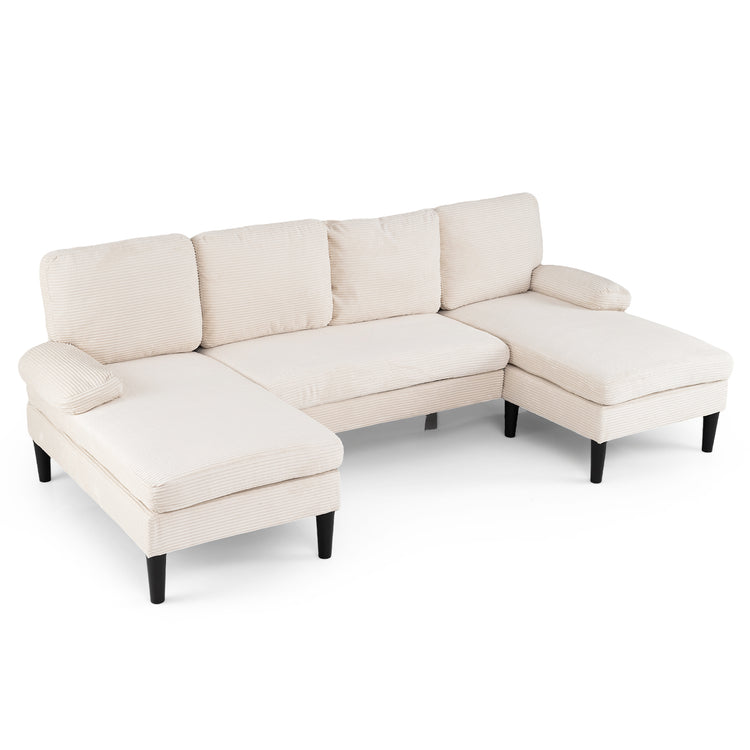 Transform your living space with this spacious U-shaped sectional sofa featuring dual chaise lounges, perfect for family gatherings or relaxing evenings. Crafted from soft corduroy or chenille fabric with anti-pilling technology, it combines style with durability. The ergonomic design includes deep seats, plush back cushions, and nap-friendly armrest pillows, all supported by a heavy-duty wooden frame and high-density sponge filling with pocket springs for ultimate comfort. With a weight capacity of 1000 lbs and 10 sturdy legs with non-scratching foot pads, this sofa ensures stability and floor protection while accommodating 5-6 people. Assembly is required, and cushions may take up to 72 hours to fully expand after unpacking.
